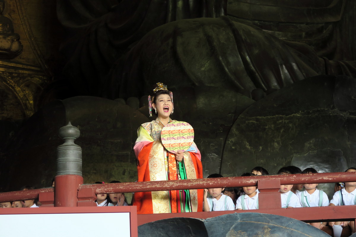 Солистка одетая в традиционный наряд исполняла арии на японском, а за ней в ряд сидели дети.