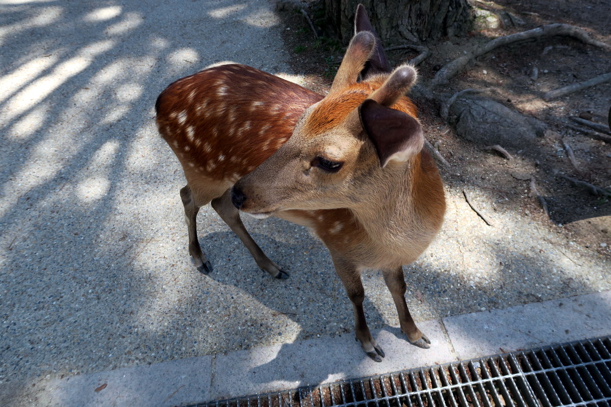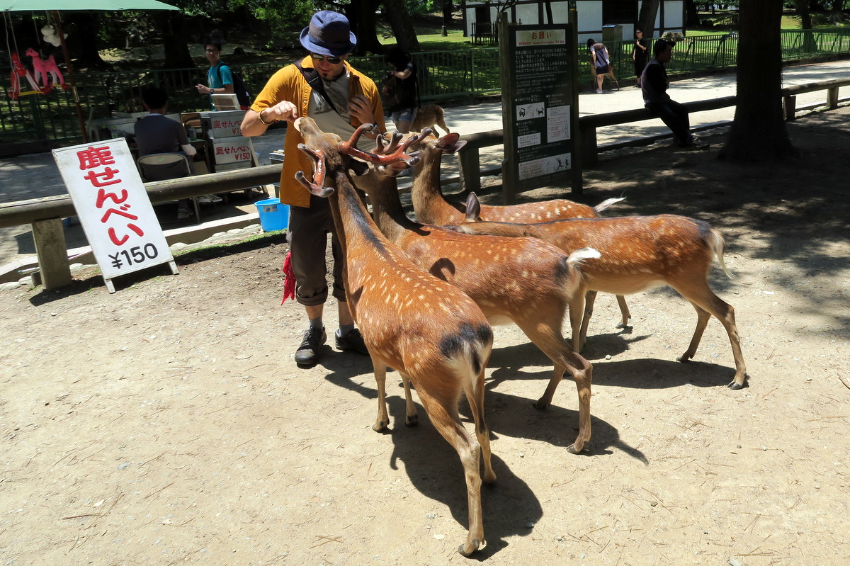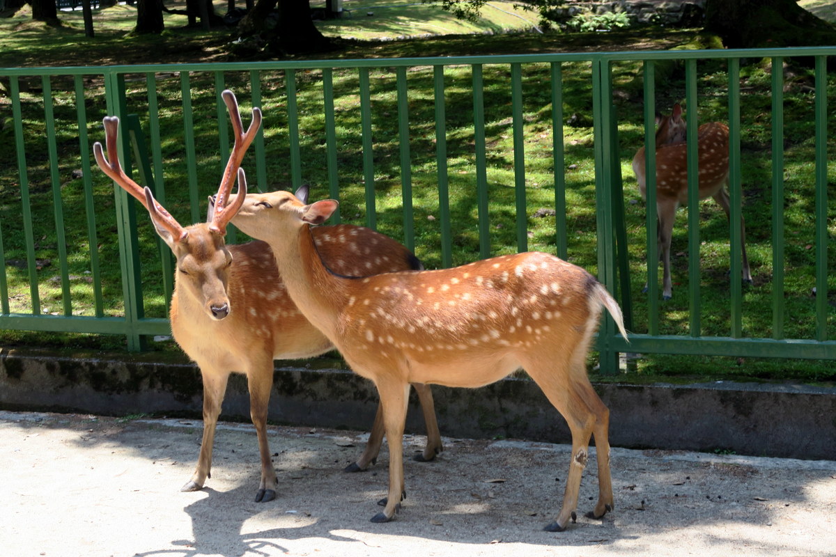 Оленьи рога Сенто-Куну достались неспроста. По легенде, когда императорский двор обосновался в Наре, бог-громовержец приехал защищать его на белом олене. С тех пор олени - неотъемлемая часть города. Они свободно бродят по парку в огромных количествах, ни капли не пугаясь туристов. Летом они красивые, рыжие в белых пятнах - прямо как Бэмби.