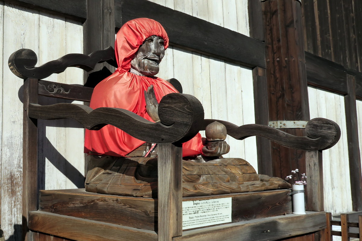 Около выхода из павильона сидит деревянная статуя бодхисаттвы Кшитигарбха (японцы называют его Дзизо). Говорят, если у тебя что-то болит, надо потрогать то место на этом чудаке в чепчике, и оно пройдёт. Я в такие байки не верю. Но потрогал конечно на всякий случай.