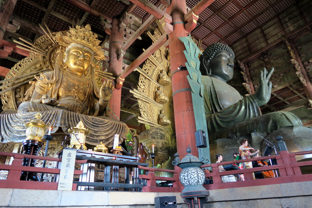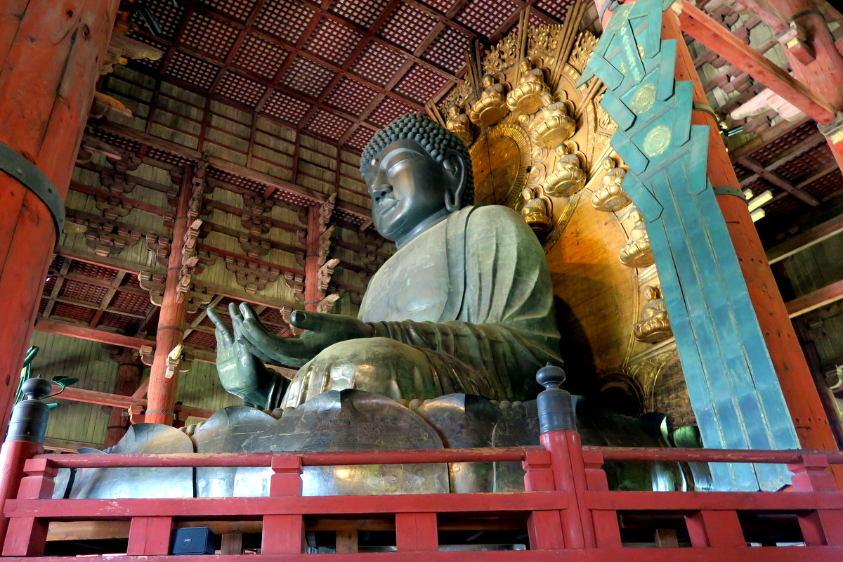 А вот и сам великий Будда. Работа над ним заняла почти десять лет, и чуть не обанкротила страну. Для её изготогления пришлось скупить практически всю бронзу, которая тогда была в Японии. Недавно учёные с помощью рентгена нашли в колене 15-метрового Будды жемчужное ожерелье, древнее оружие, и даже человеческий зуб! (Всё это они из колена выковыривать не стали.)