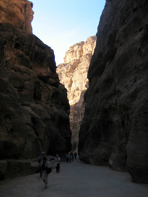 Дорога спускается в ущелье. По обе стороны от неё вырастают отвесные стены пятидесятиметровой высоты. Их цвет варьирует от песчанно жёлтого до оранжеватого, а иногда граничит с красным. Когда-то на дне этого каньона текла река. Набатеи, построившие тут город лет сто до нашей эры, направили её в арыки, остатки которых до сих пор видны по бокам дороги. Дно ущелья спускается под небольшим но постоянным наклоном. Легко представить как две тысячи лет назад вдоль дороги журчала вода, снабжающая город который располагался в конце полуторакилометрового "Сика".