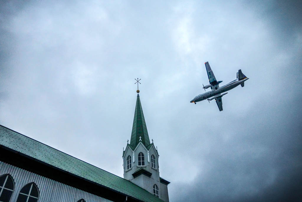 Посреди Рейкьявика расположен аэропорт. Раньше наверное это считалось окраиной, но теперь пять минут ходьбы от главного собора. Когда начали летать большие самолёты расширять под них этот аэропорт уже было некуда - вокруг был город - поэтому построили новый, в сорока минутах езды. Но старый не закрыли. Сюда до сих пор летают пропеллерные самолёты, каких редко увидишь в главных аэропортах мира. Не двухместые Сессны, а средних размеров такие, пассажирские, обслуживающие ближние рейсы. Когда такой идёт на посадку, пролетает очень низко, прямо над центром города, тарахтя пропеллерами. На некоторых снизу даже реклама нарисована для туристов.