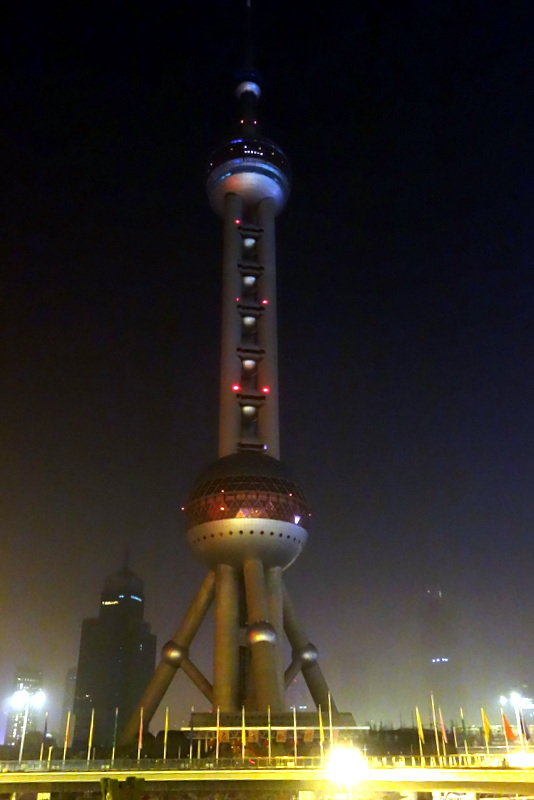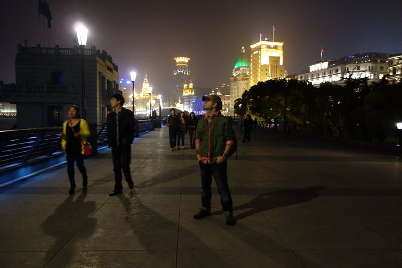 Прилетев в Шанхай, и бросив вещи в гостинице, мы с Сашей первым делом двинулись погулять по Бунду. На самом деле вид за нашей спиной - это не сам Бунд. Это Пудонг - район которому чуть больше двадцати лет (его Википедия называет "Пудун", но... Ну вы поняли.) В 1994 году была достроена телебашня Восточная Жемчужина, которая стала первым высотным зданием на том берегу реки (она до сих пор остаётся самым ярким и узнаваемым из них). С тех пор, новые высотки возводятся в Пудонге ежегодно. Вид на Пудонг - особенно когда его "включают" вечером - одна из прелестей Бунда. Сегодня все самые высокие здания Шанхая находятся в Пудонге.