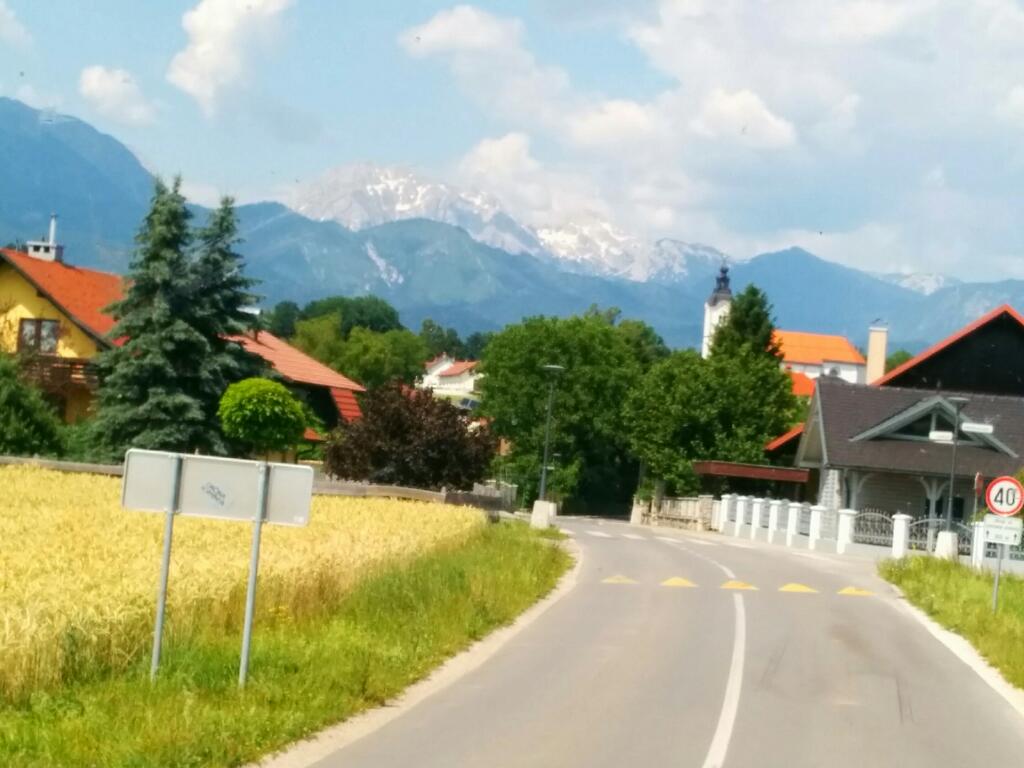 Вокруг сплошные зелёные поля, иногда попадаются одноэтажные городки, постоянно часовни разные, а вдалеке горы.