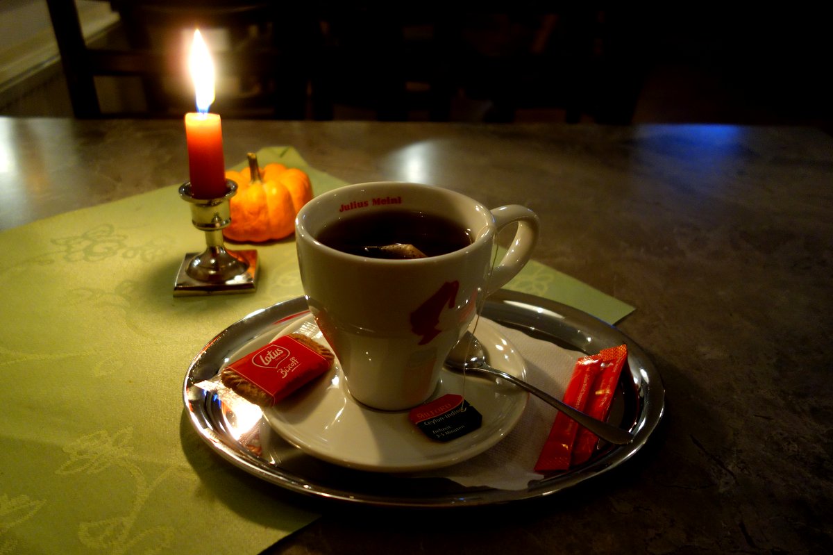 Любопытную вещь заметил... Если в кафе заказываешь чай или кофе, их подают на таком милом подносике. То есть, как и во всей Европе будет фарфоровая чашечка, блюдце, ложка, пакетик сахара и печенье какое-нибудь. Но тут всё это кладут на небольшой серебрянный поднос, чтоб было больше места разложиться.