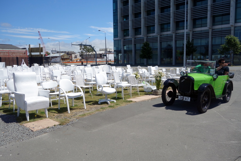Вот в этой инсталяции 185 пустых белых стульев (все они разные), в память жертв землетрясения. Какой-то предприимчивый мужик возит зевак на туры по разрушенному городу на антиквардной машине.