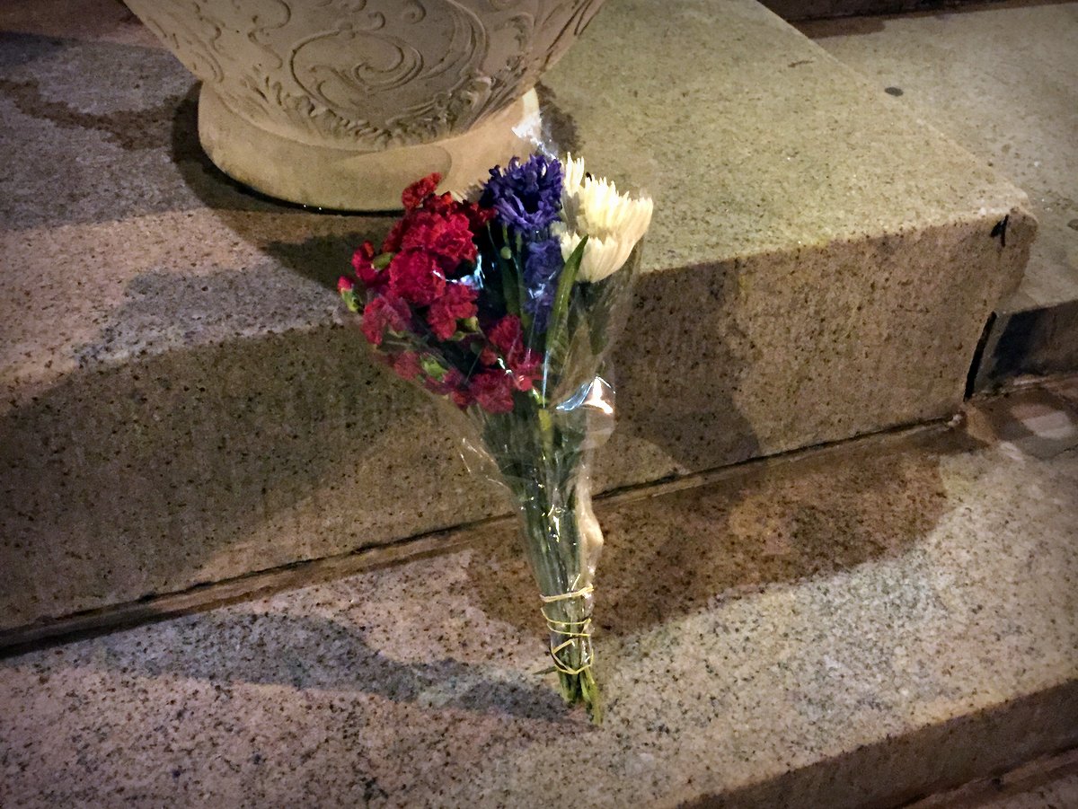 Говорят что повсюду цветы у консульств и посольств убирают. Например подруга из Лондона написала что там так. Может поэтому в Нью Йорке они и лежат на тротуаре. Я подумал, лучше всё равно на ступеньки положу. Прислонил там букет, он очень одинкок выглядел.