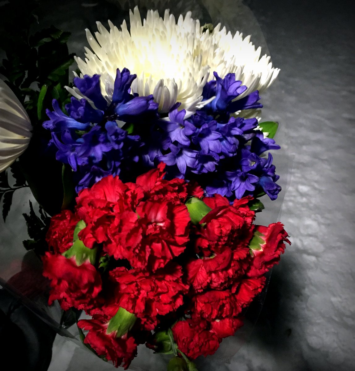 Мой букет - под цвет российского триколора. Ну, синий конечно не совсем как надо, но где ж сейчас синие цветы то найдёшь?.. Долго объяснял мексиканцу в магазине что я не хочу их перемешивать.