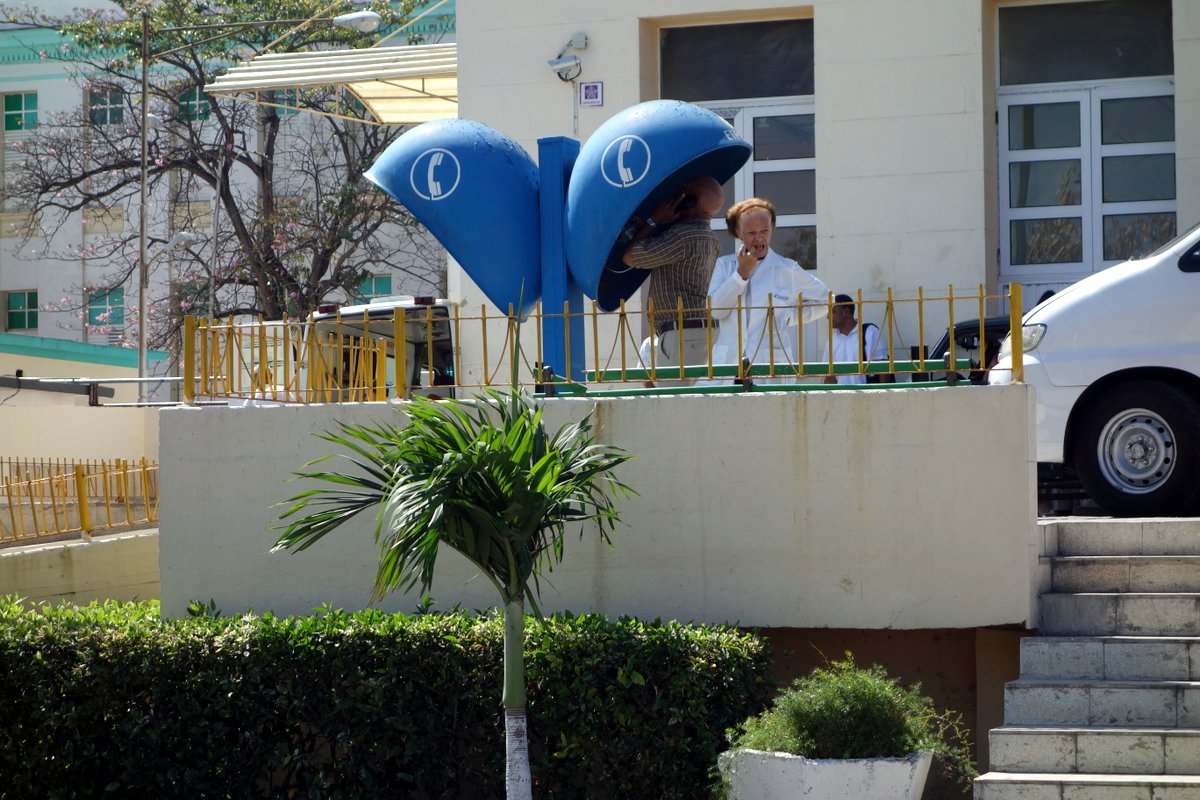 Мобильники и домашние телефоны всё ещё не дошли до всех рядовых кубинцев. Поэтому на улицах города до сих пор стоят телефоны автоматы. Бывают вот такие отдельно стоящие, похожие на сушилки для волос, а бывают попроще, прикрученные к стенам зданий.