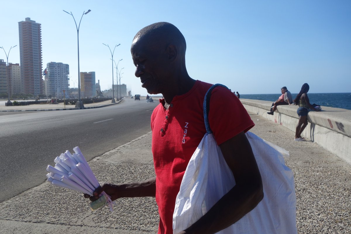 Единственное развлечение на набережной, кроме рыбаков, это вот такие чуваки, ходят продают свой товар. Нет, это не букет из косяков - это кульки с солёными орешками. Они местным заменяют семечки. Стоят они по одному Национальных песо (или двадцать центов).