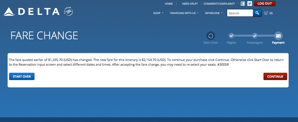 Заказывал сегодня очередные авиабилеты. Сложный маршрут - шесть сегментов, три остановки, куча вариантов. Но вот, вроде нашёл нужную комбинацию, перешёл из поисковика на сайт Дельты. Вот рейсы, вот цена - $1,335. Не дёшево, но тут много перелётов, да и не близко - в Сингапур лечу. Короче, подходит.
