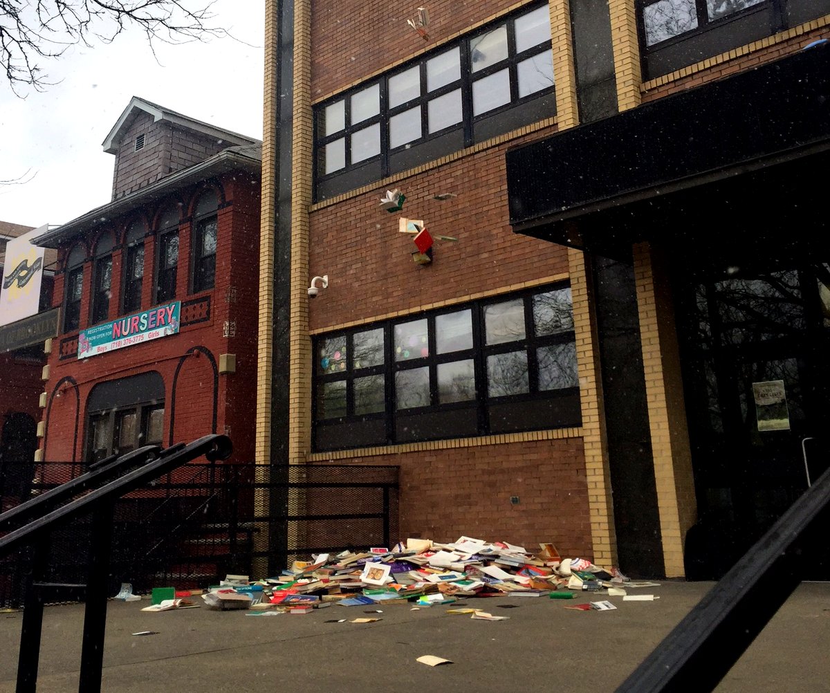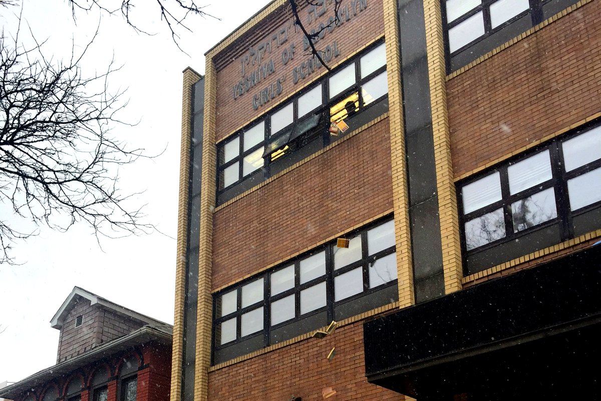 Я очень заинтересовался, подошёл поближе посмотреть. Книги летели из приоткрытых окон на верхнем, этаже большого кирпичного здания. На фасаде надпись: "Yeshiva of Brooklyn Girls School" - религиозная еврейская школя для девочек. В окнах то и дела появлялись силуеты людей, которые стопками выпихивали из окна книги. Многие были в одинаковых ярких переплётах - вроде учебники.