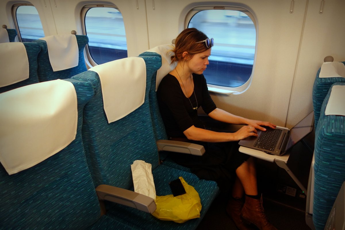 Вагоны полностью сидячие (ночью синкансэны не ходят), но очень удобные, с глубоко опускающимися спинками, столиками и даже розетками. Каждые пару вагонов есть туалеты и даже курилки (раньше были "курящие" вагоны, но сейчас их почти не осталось). Прокатиться в таком составе два с половиной часа не напряжно, а так как приезжаешь как правило уже в город (пусть и не всегда в самый центр), то для переездов до четырёх-пяти часов они во многом выигрывают у самолётов. По составам ходят девушки с тележками, продают напитки и еду.