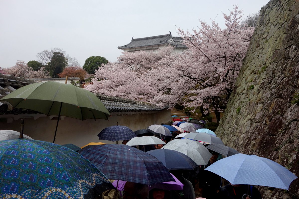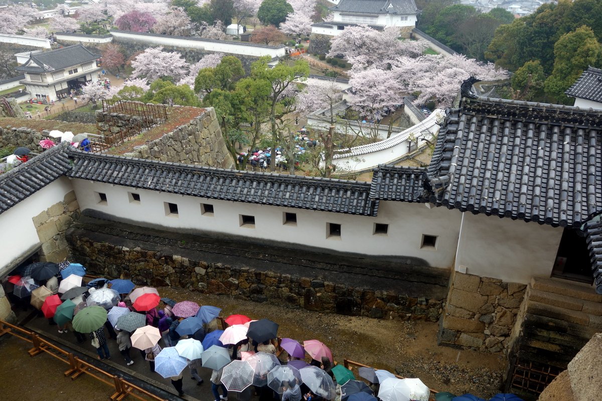 Для нас же навигация не стала проблемой - из за того что замок только открыли было полно народу. Туристы терпеливо выстроились в аккуратную японскую очередь прямо от самого входа. А так как с погодой нам не повезло, это была аккуратная японская очередь под дождём.
