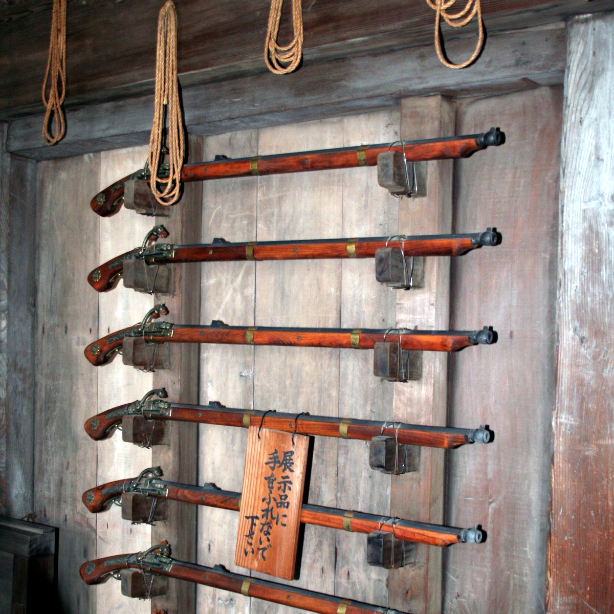 Остальные залы замка в основном пустые, в традиционном японском стиле. На стенах остались держалки, куда раньше вешалось оружие. К сожалению после реконструкции они пустуют. А раньше висели мушкеты: