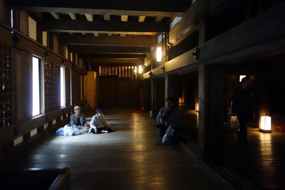 В подвале людей мало, тут хорошо видно "убранство" помещений замка. Большие пустые залы из тёмного дерева. Наверное при такой толпе желающих, посещение самого тенсю можно было бы пропустить, тут внутри самое интересное - это вид из окна.