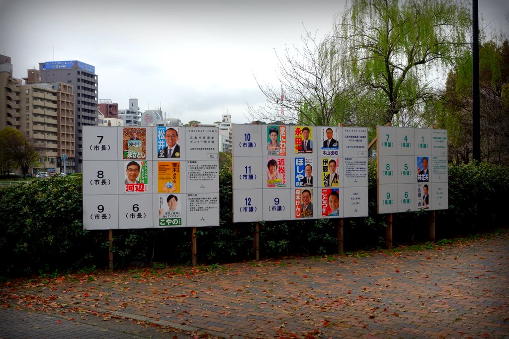 В Хиросиме местные выборы. Портреты кандидатов вывешивают на щиты в районе, чтоб все избиратели видели.