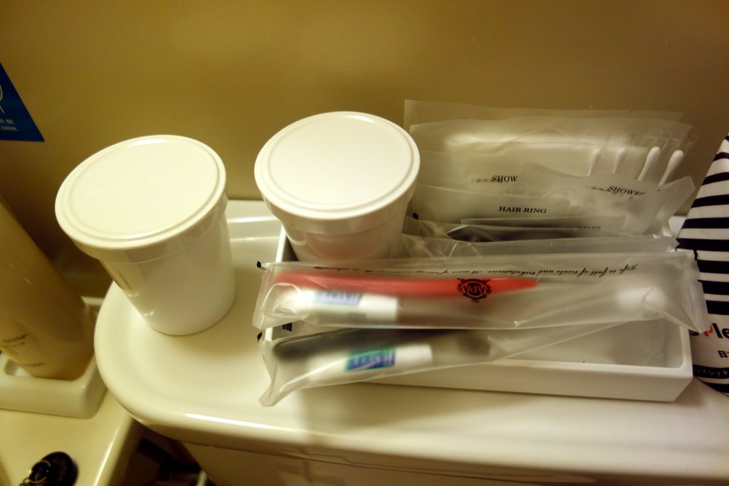 Если вы проживаете в отеле, и забыли на ночь зайти в комбини - не беда. Помимо тапочек в комичном ассортименте, японские отели так же предоставляют постояльцу всевозможные одноразовые полезности. Здесь не только шампуники и шапочка для душа, но и бритвы, зубные пасты и щётки. Всё в двух комплектах.