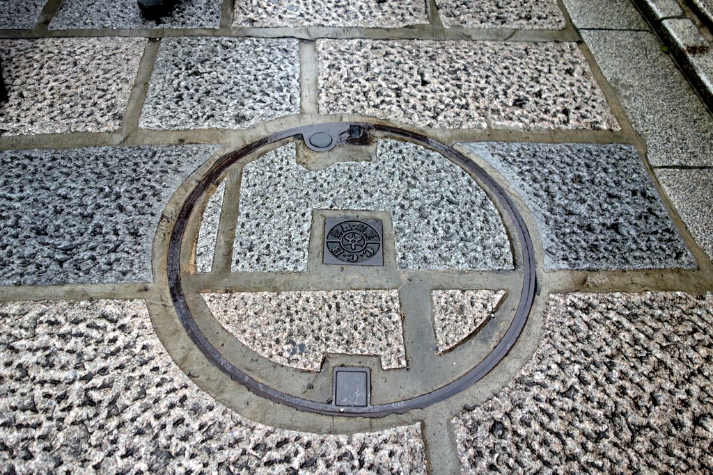 А вот в Киото люки не такие броские, но всё же тоже очень красивые - их маскируют под каменный тротуар - аккуратно вырезают кусочки каменных плит, и вставляют в диск люка:
