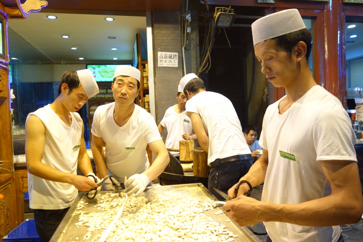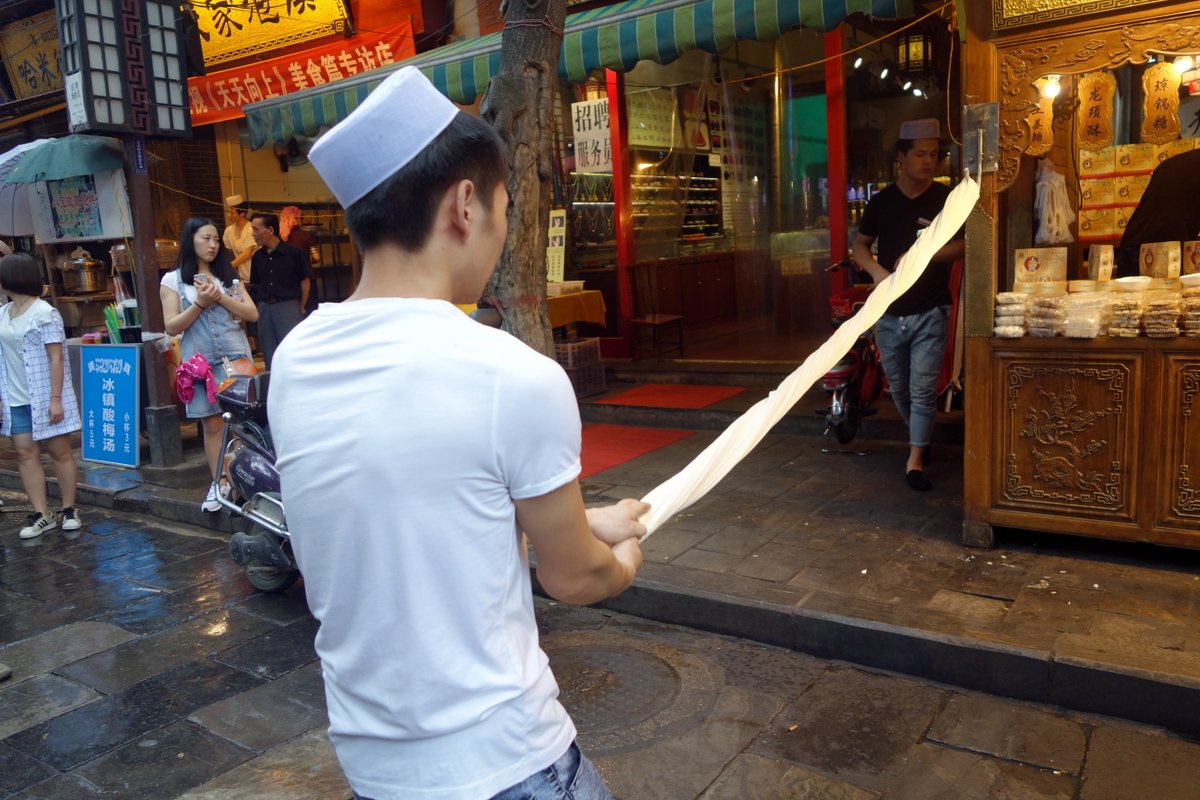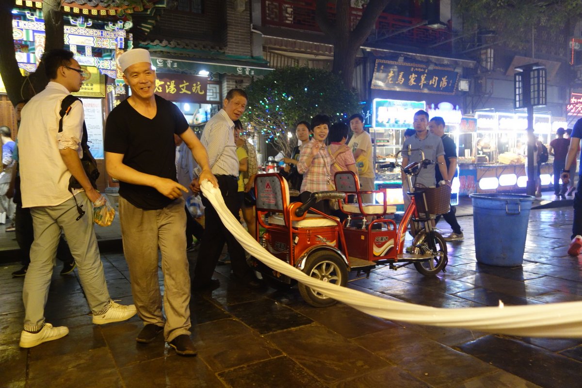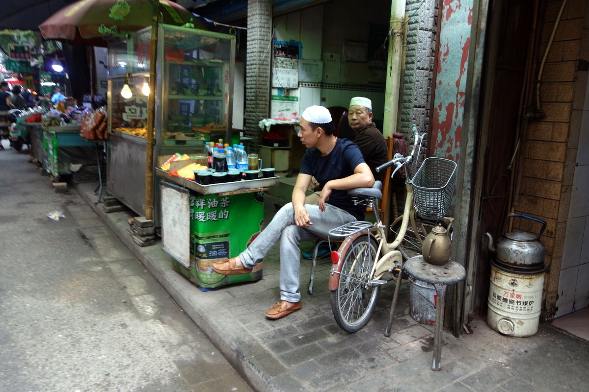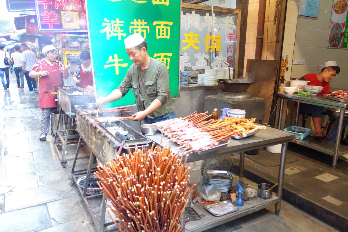 Много китайцев жарят мясо на "шомпурах" сделанных из толстых прутиков. Свинины тут разумеется не найти - всё мясо должно быть халяльное.