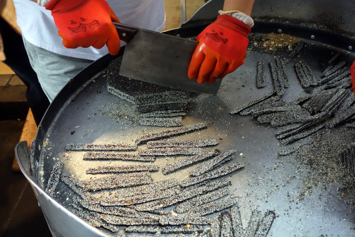 Рядом есть сладости, которые делают из кунжута. Их вроде молотками не бьют, и через пол-улицы не оттягивают, но зато режут очень внушительными тесаками. Юля не удержалась, и купила на попробовать.