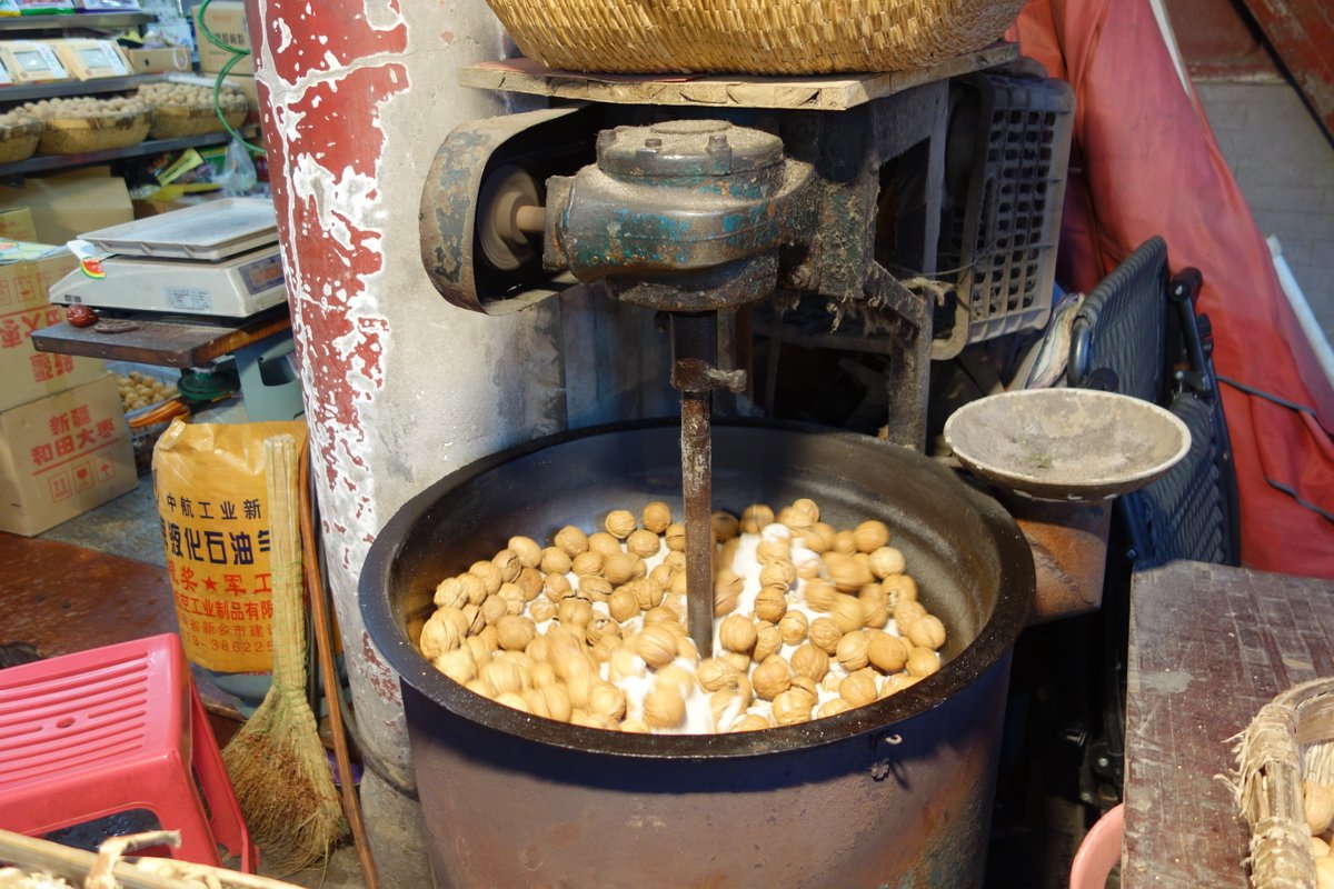 Из других интересных агрегатов заполнилась машинка для обжарки грецких орехов. Они лежат в такой вот чугунной мешалке, в которую ещё насыпана соль. Снизу горит огонь, а мотор постоянно крутит всё содержимое, размешивая его. Принцип работы всего этого остался для нас тайной.