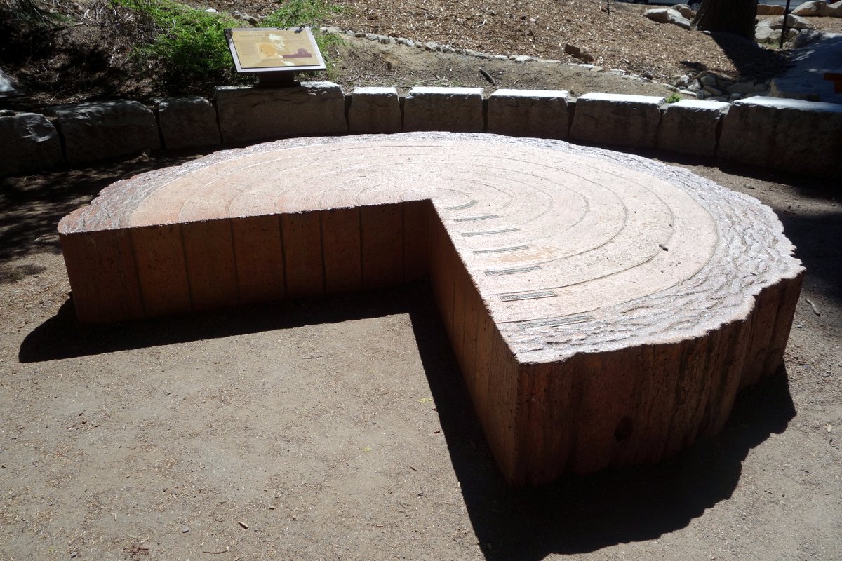 Около входа в рощу установлен разрез цементного "пня" секвойи, на котором наглядно показан теоретический возраст дерева: