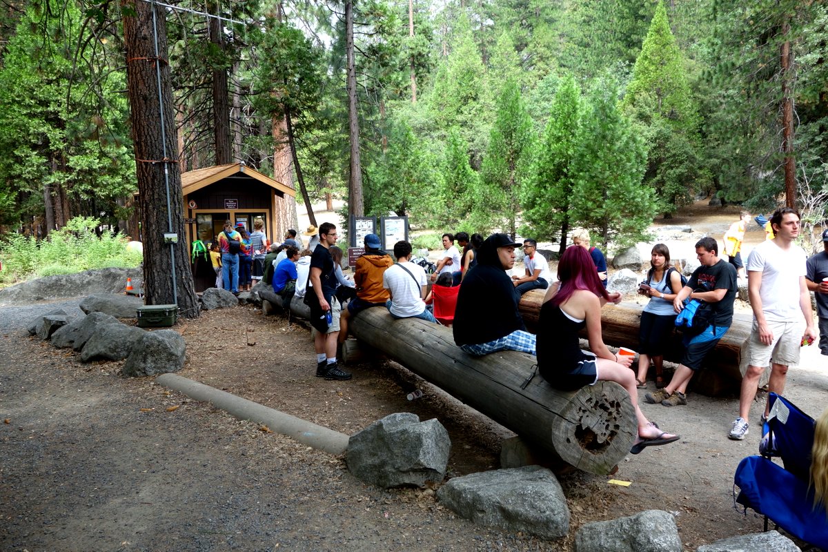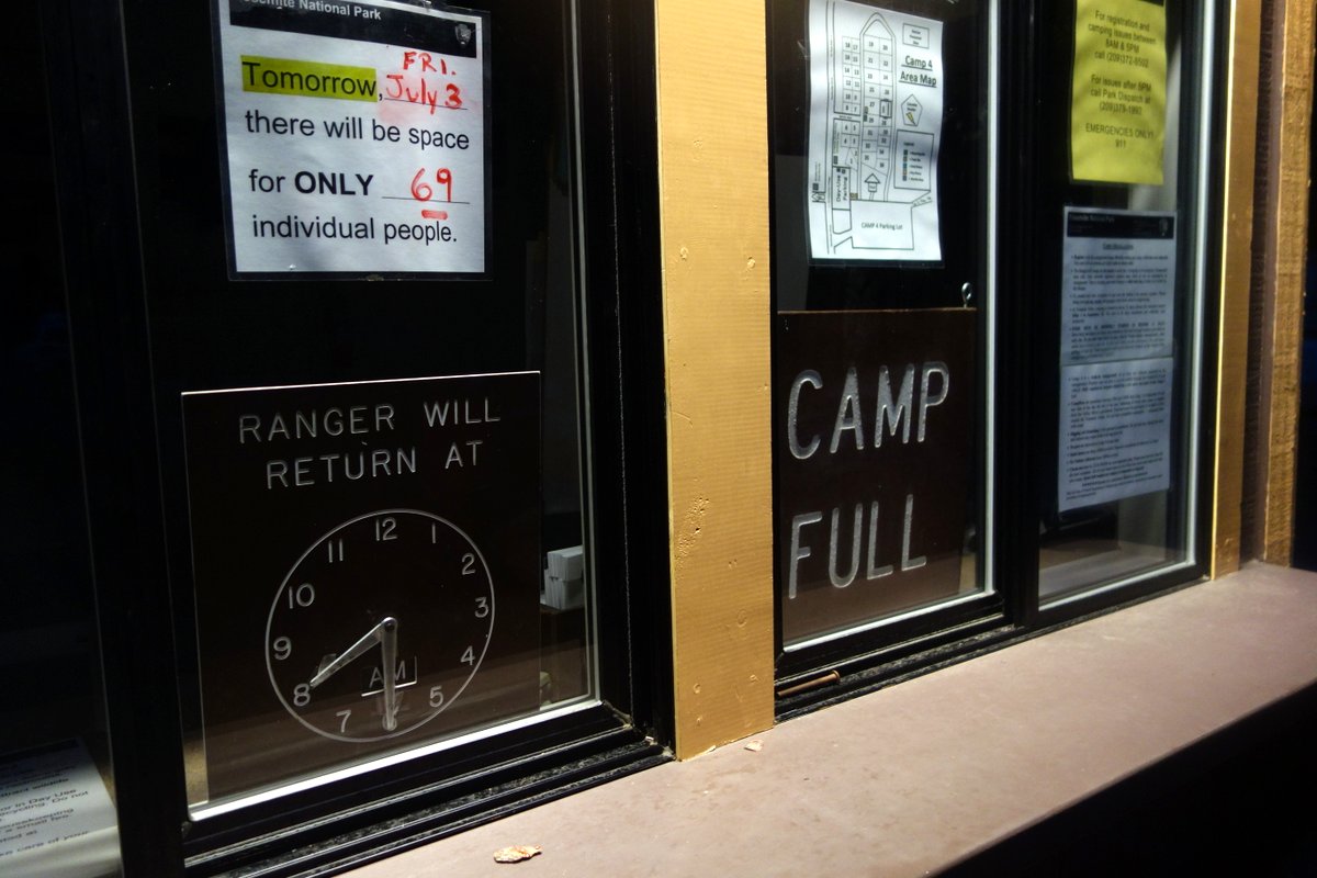 Каждое утро, свободные места в Camp 4 раздаются желающим на основе first-come-first-served - людей заселяют в порядке очереди, пока не закончатся места. Будка с регистрацией открывается в 8:30 утра, но в популярные дни к этому времени к ней уже образовывается внушительная очередь.