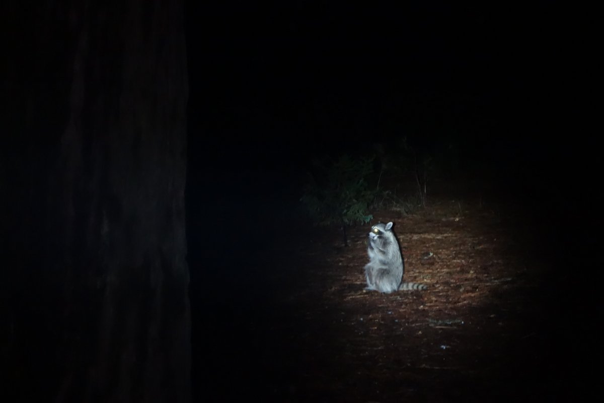 А вечером, когда стемнело, к нам ещё и енот пришёл еду таскать. Наглая тварь, никак его было не отпугнуть. Всё таскал печенье, которое Чуи оставил на столе.