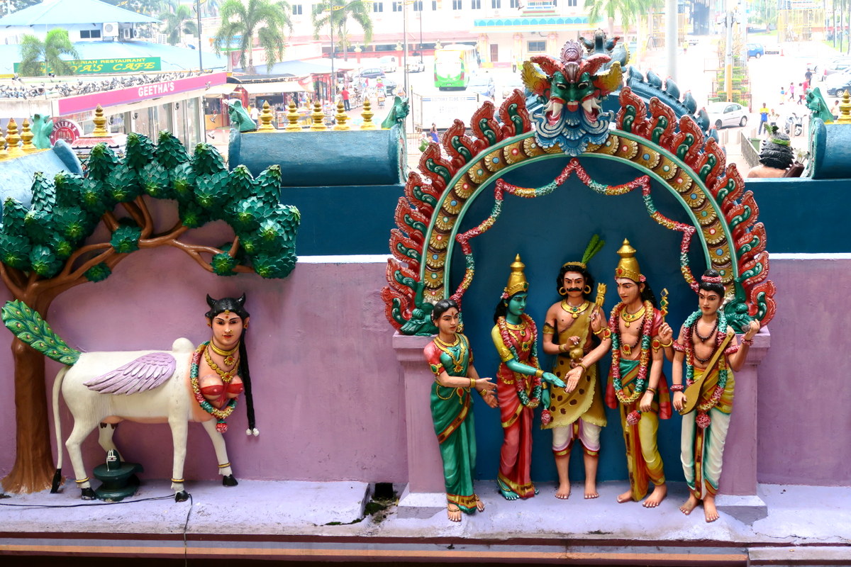 А вот и сам Муруган, его ещё называют Сканда, он бог войны. Если б я не прочёл, что его меньше десяти лет назад закончили, охотно бы поверил, что этой статуе уже за сто лет. Чтоб её покрасить из соседнего Тайланда привезли 300 литров золотой краски!