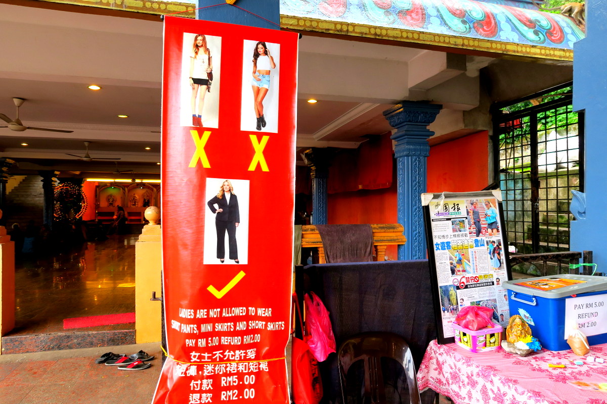 Перед входом висит памятка девушкам (и дамам), о том в каком виде подобает входить в храм. В шортах и с короткими рукавами нельзя. Рядом дежурят тётушки, которые отлавливают несчастных туристок, и заставляют их замотаться до уровня приемлемой скромности - для этого у тётушек есть специальные шали.