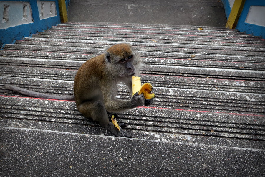Те совсем не стесняются, получив банан не убегают с ним куда-нибудь, а спокойно жрут его прямо на ступеньках. Все туристы тут же сбегаются пофотографировать. Местные смотрят на них с лёгким недоумением - чего мол мартышек фотографировать? Только пробки на лестнице создаёте.