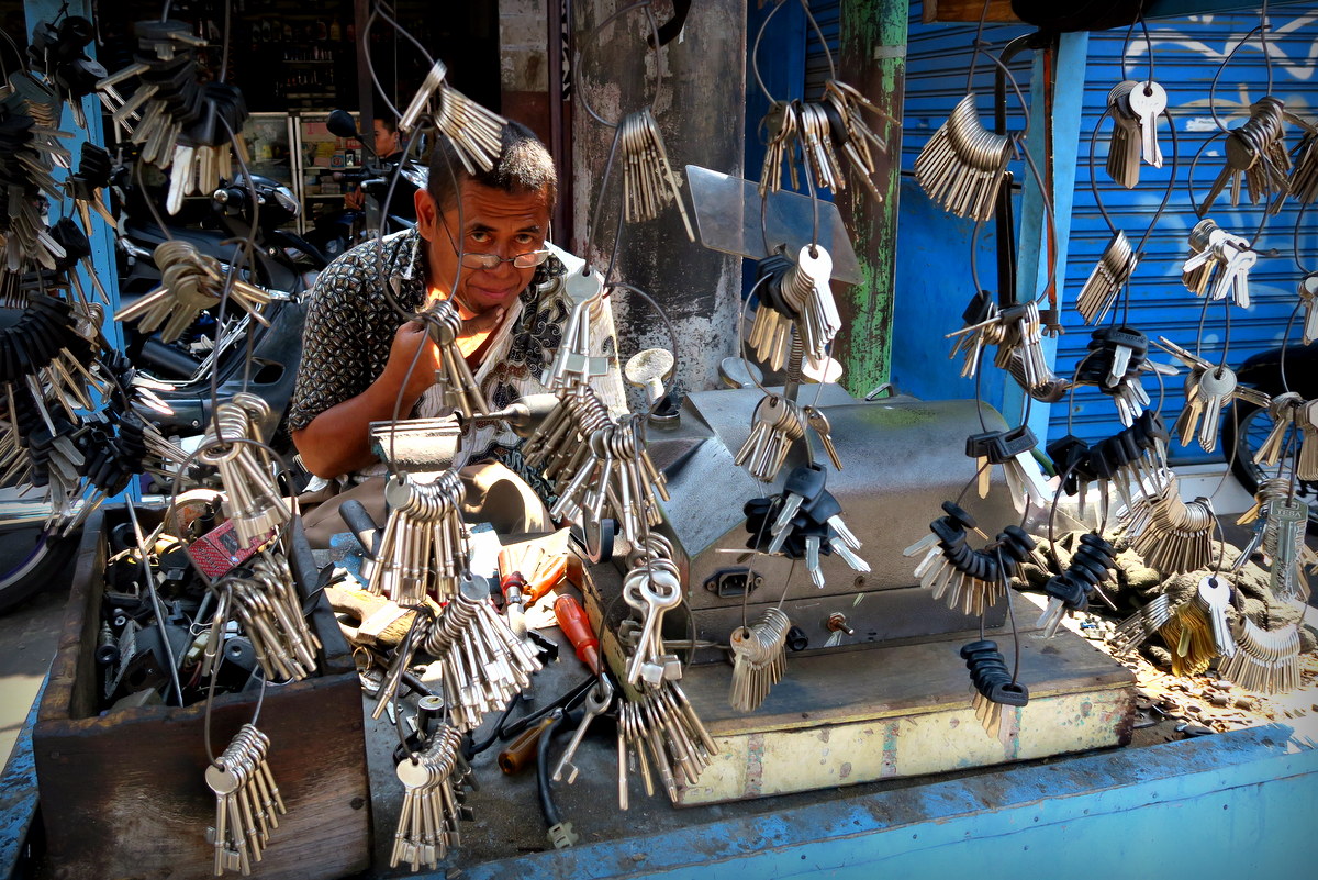 И напоследок, покажу вам мастера, который ключи делает. Просто так сидит себе в киоске, обвешанный бланками, и работает.