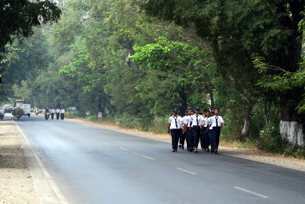 Идут себе строем по обочине, вроде без какого-либо сопровождения. Нам сказали, что это они так готовятся ко дню независимости.