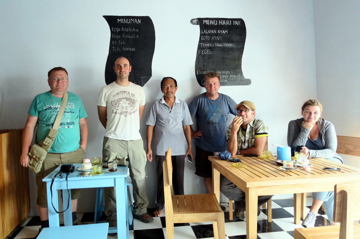 То есть есть кофейни где наливают сваренный из свежемолотых зёрен напиток, но их надо специально находить. Да и они тупо заливают кофе кипятком. Вот в эту кофейню на острове Ява нас специально отвёз гид. Тут нам хозяин - он на фото в центре - предложил местный "эспрессо", но и в нём плавал молотый кофейный порошок - пришлось ждать пока осядет.
