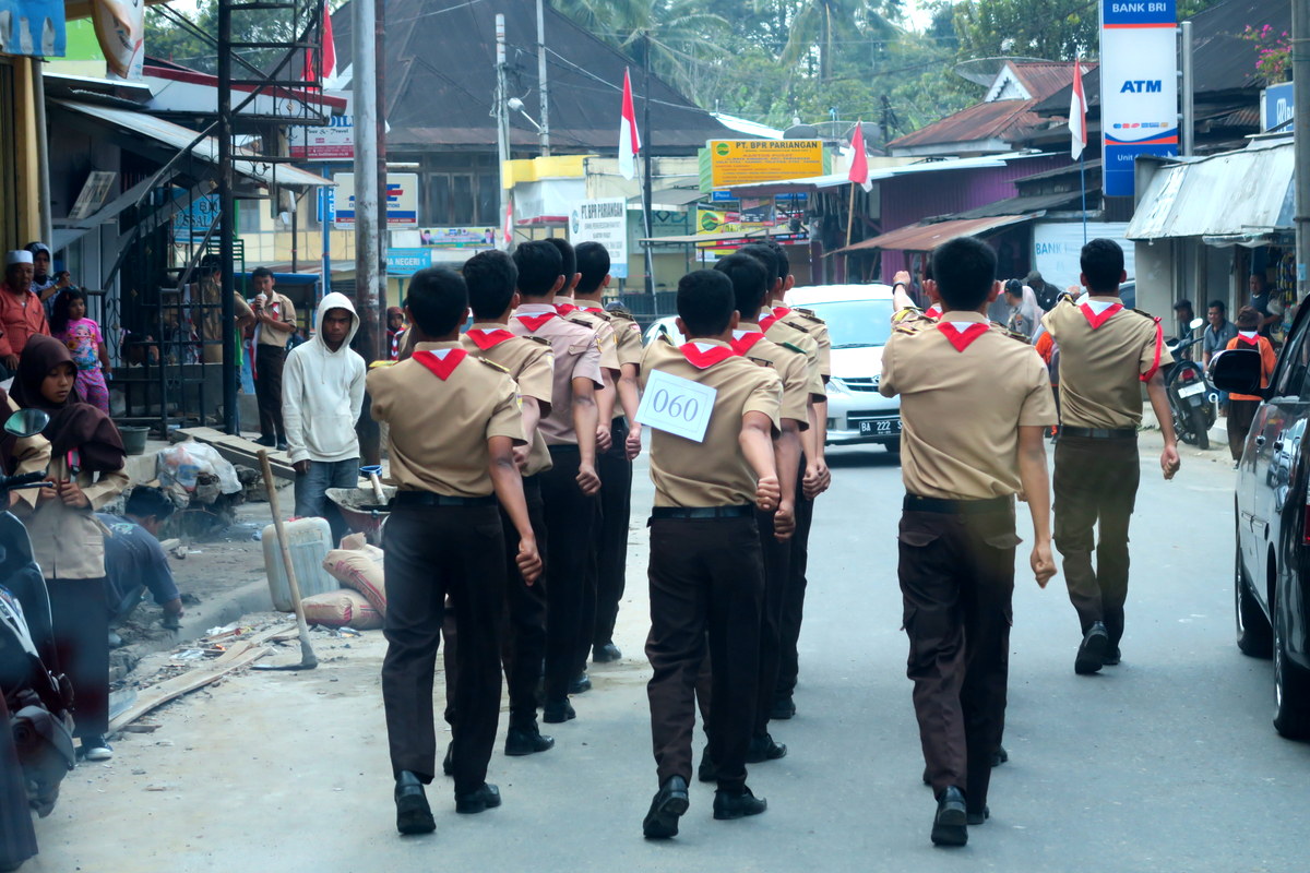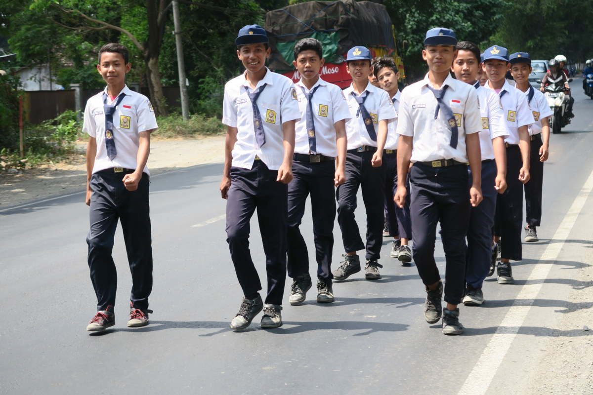 А чего только не встретишь на дорогах Индонезии?.. Вот например отряды школьников маршируют вдоль шоссе: