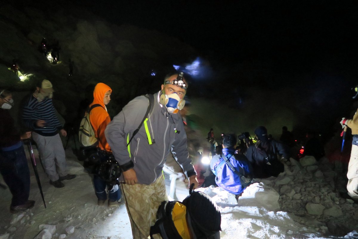 Для этого пришлось пройти рядом с местом, откуда изрыгался сульфурный дым. Из клубов кто-то громко закашлялся. На Этой витиной фотографии прекрасно видно то безумие, которое происходит ночью внутри кальдеры Иджена: