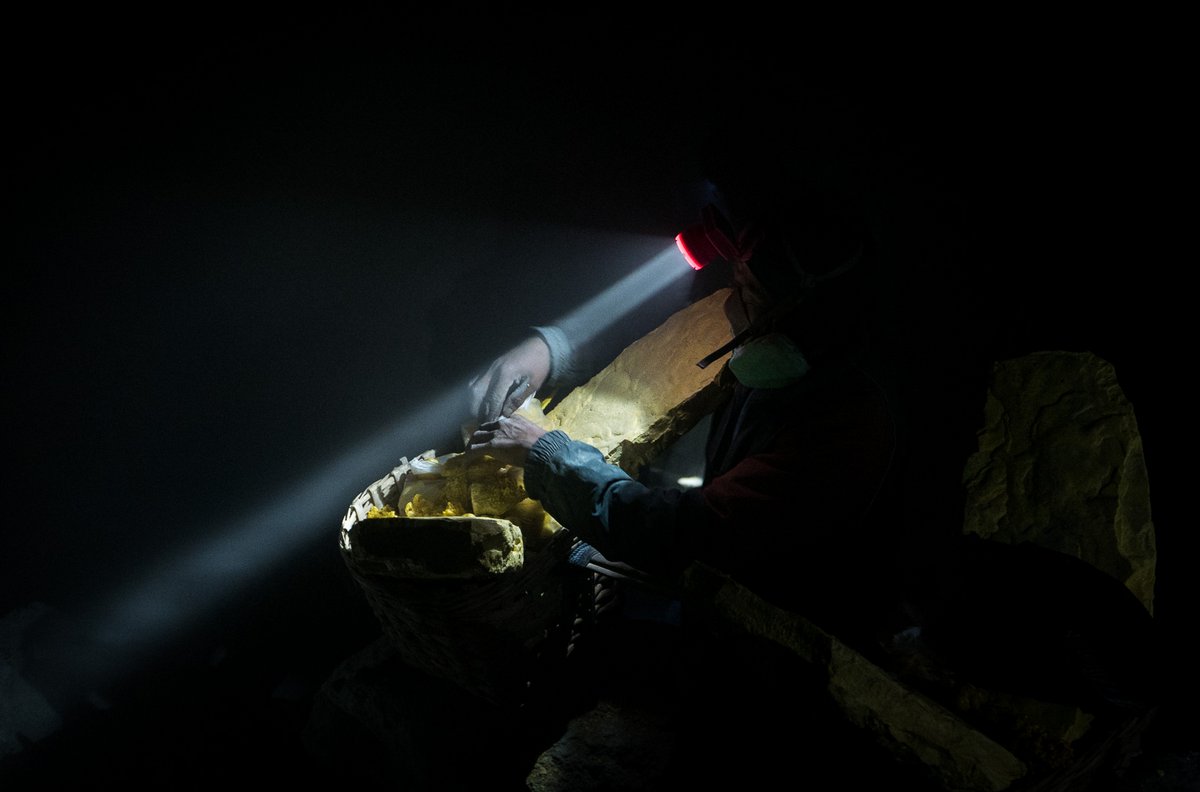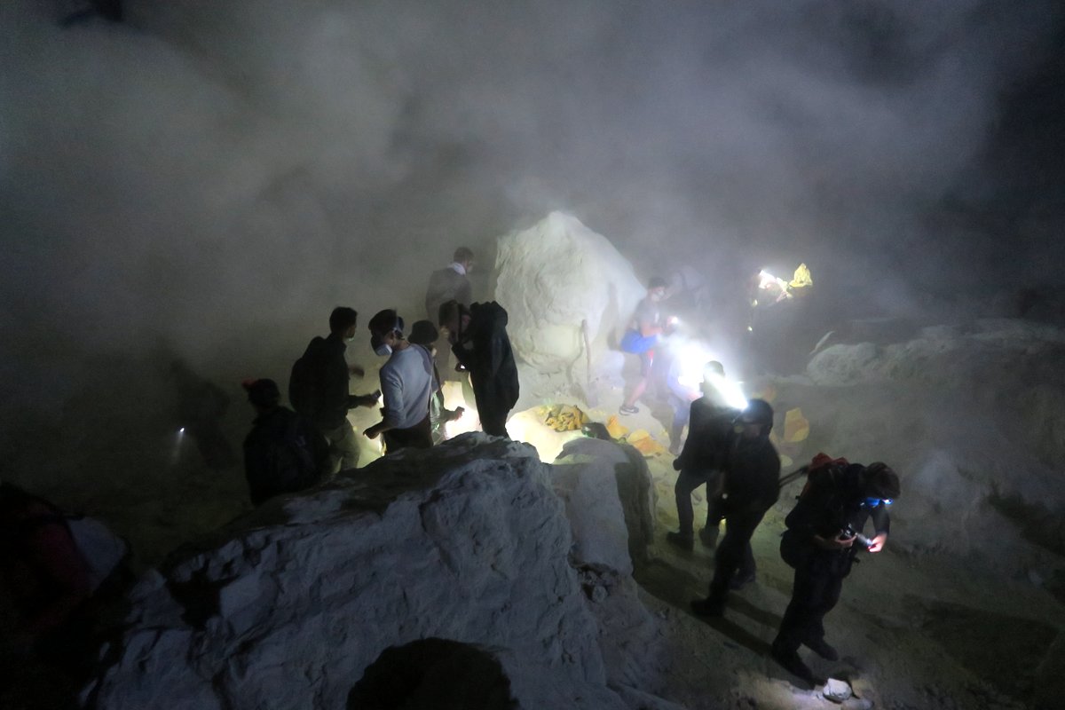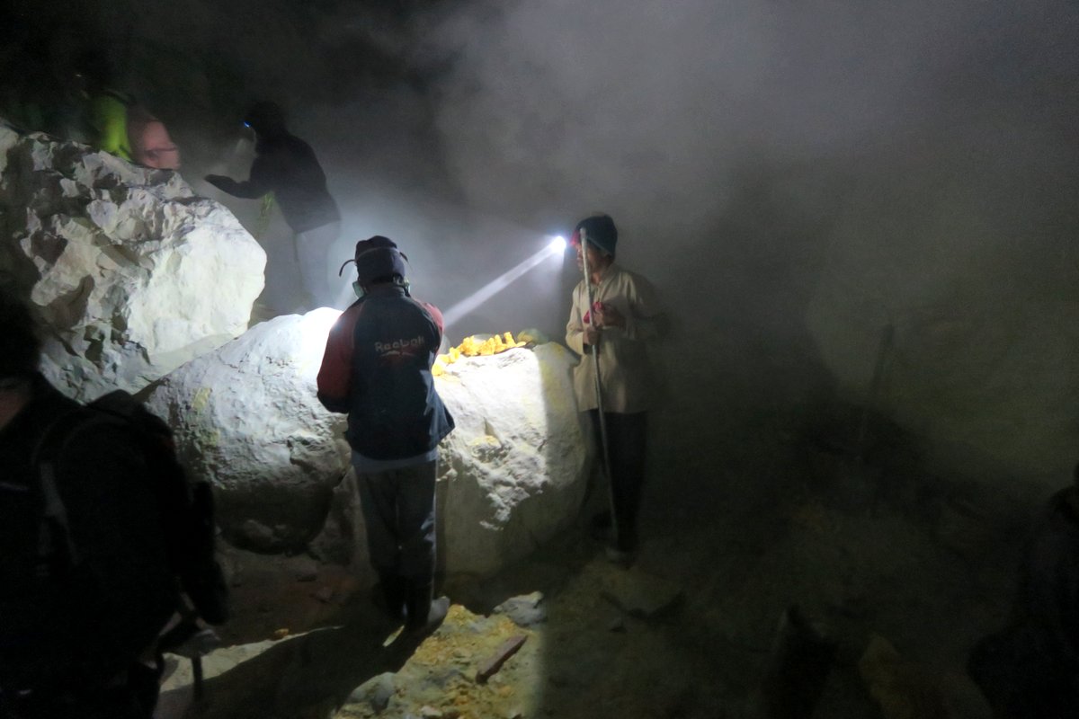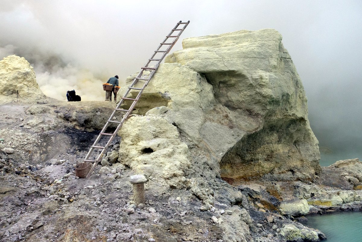 Затвердевшую серу откалывают местные шахтёры - они работают тут круглосуточно, в несколько смен. Это жители окрестных деревень, которые за копейки по нашим меркам спускаются в этот ад, и у самой скважины ядовитого дыма ломают застывшую серу, чтоб на своих плечах отнести её на перерабатывающую фабрику в нескольких километрах отсюда.