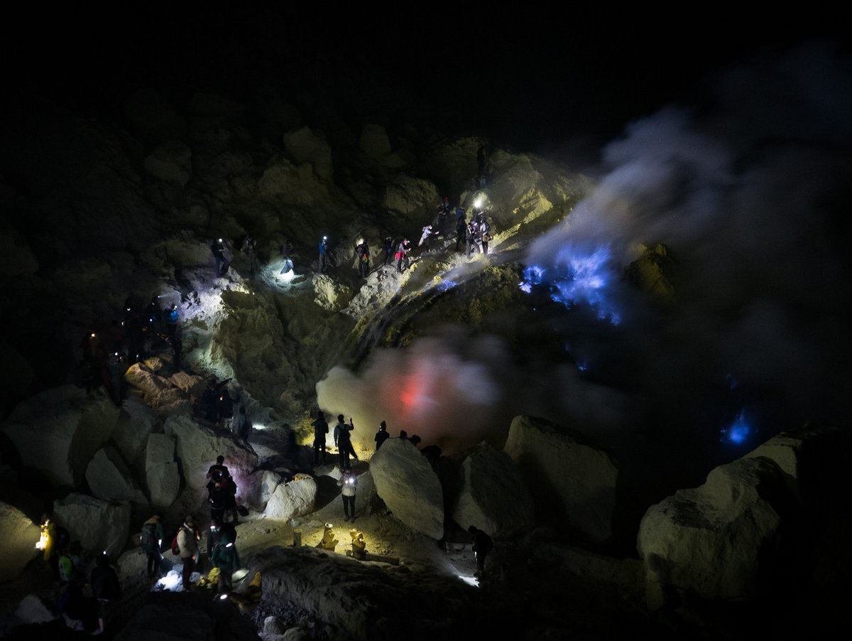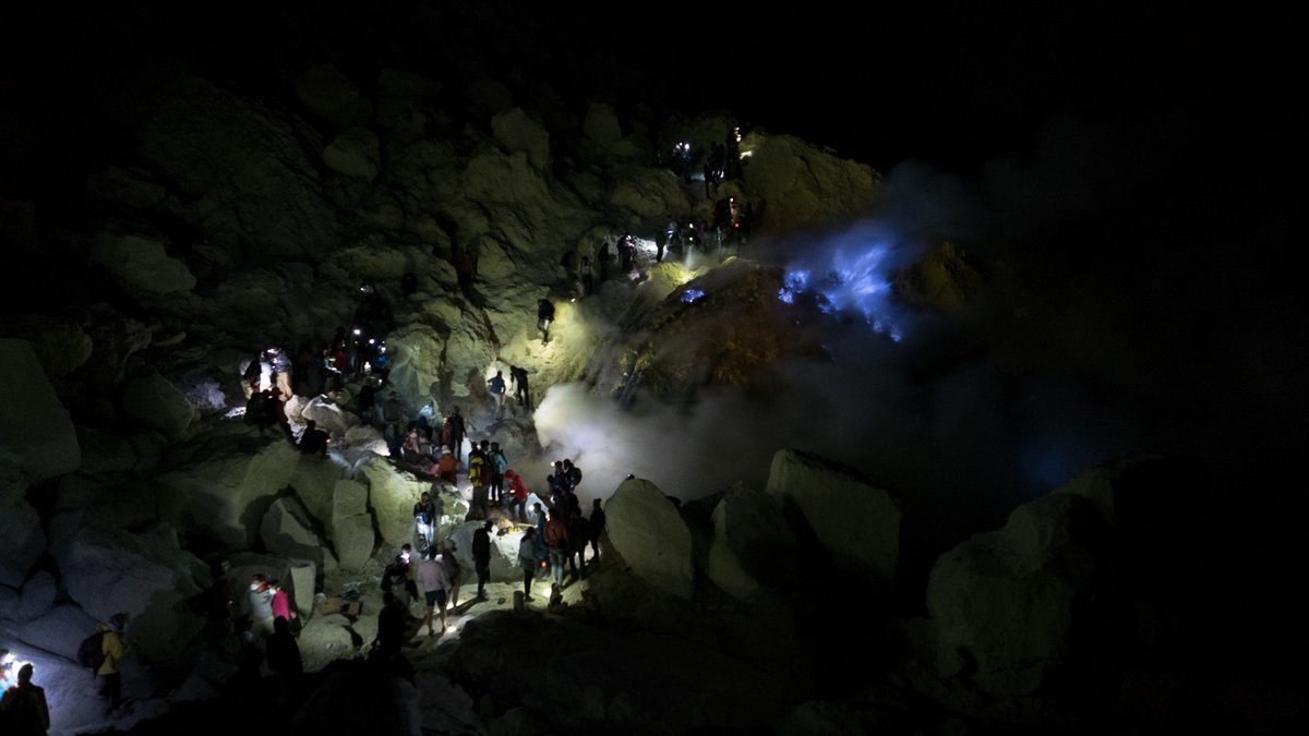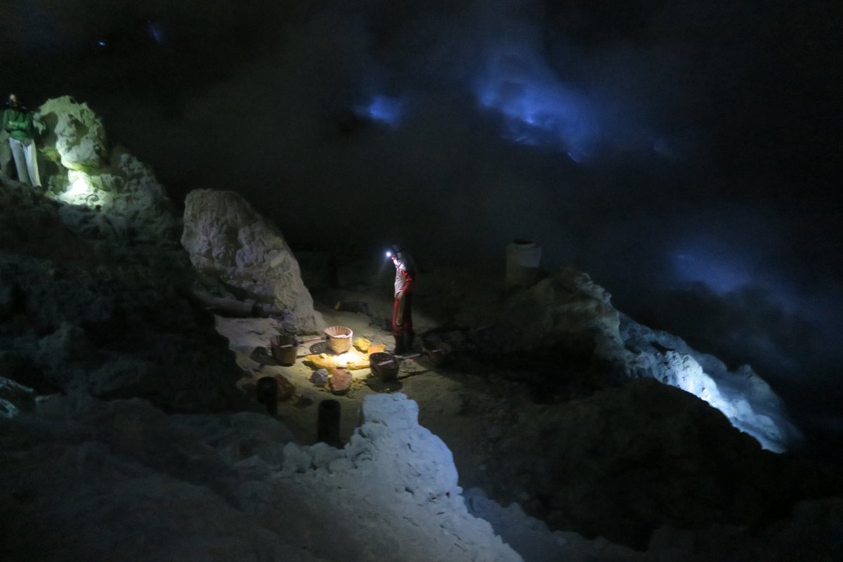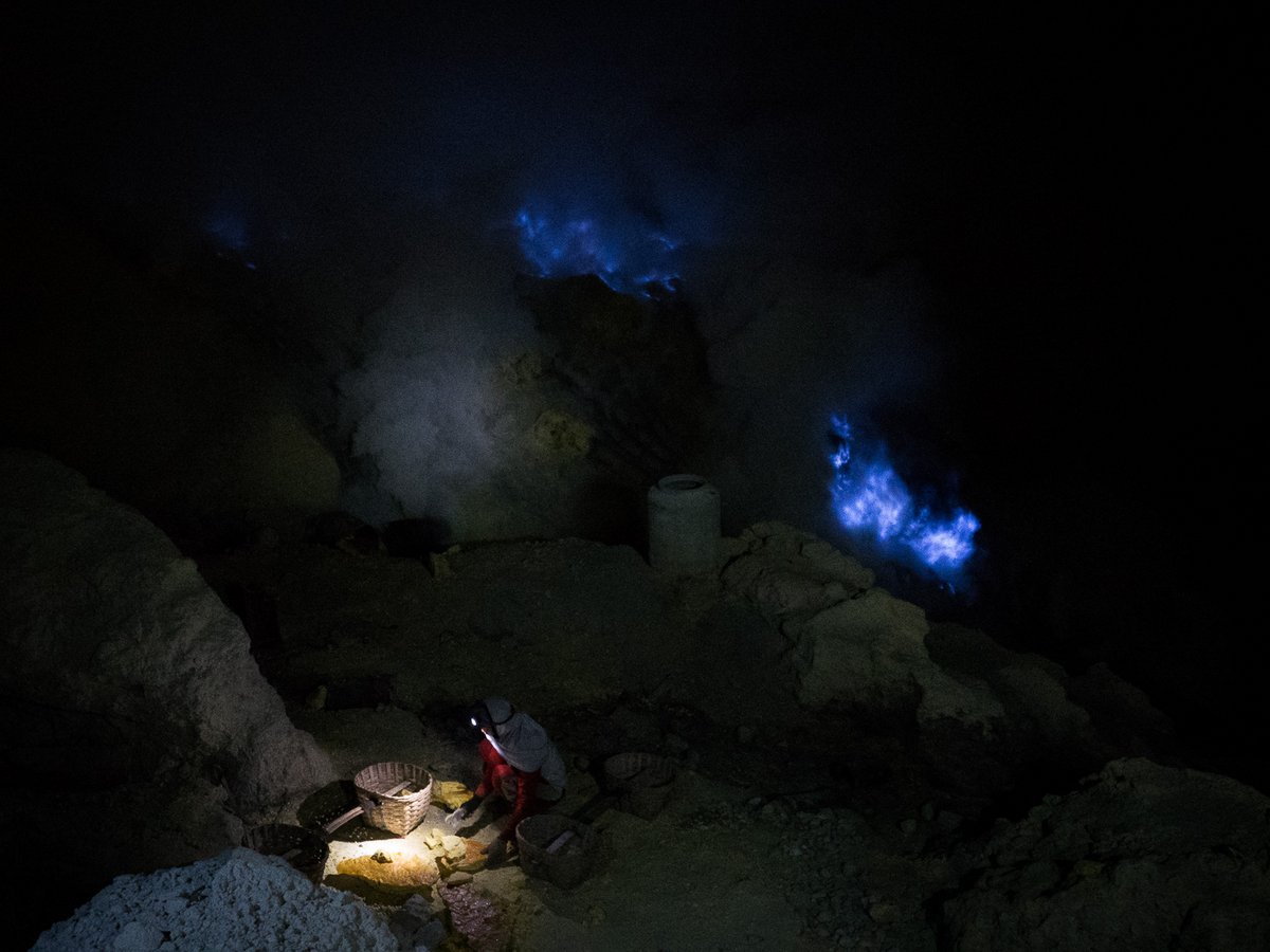 Затвердевшую серу откалывают местные шахтёры - они работают тут круглосуточно, в несколько смен. Это жители окрестных деревень, которые за копейки по нашим меркам спускаются в этот ад, и у самой скважины ядовитого дыма ломают застывшую серу, чтоб на своих плечах отнести её на перерабатывающую фабрику в нескольких километрах отсюда.