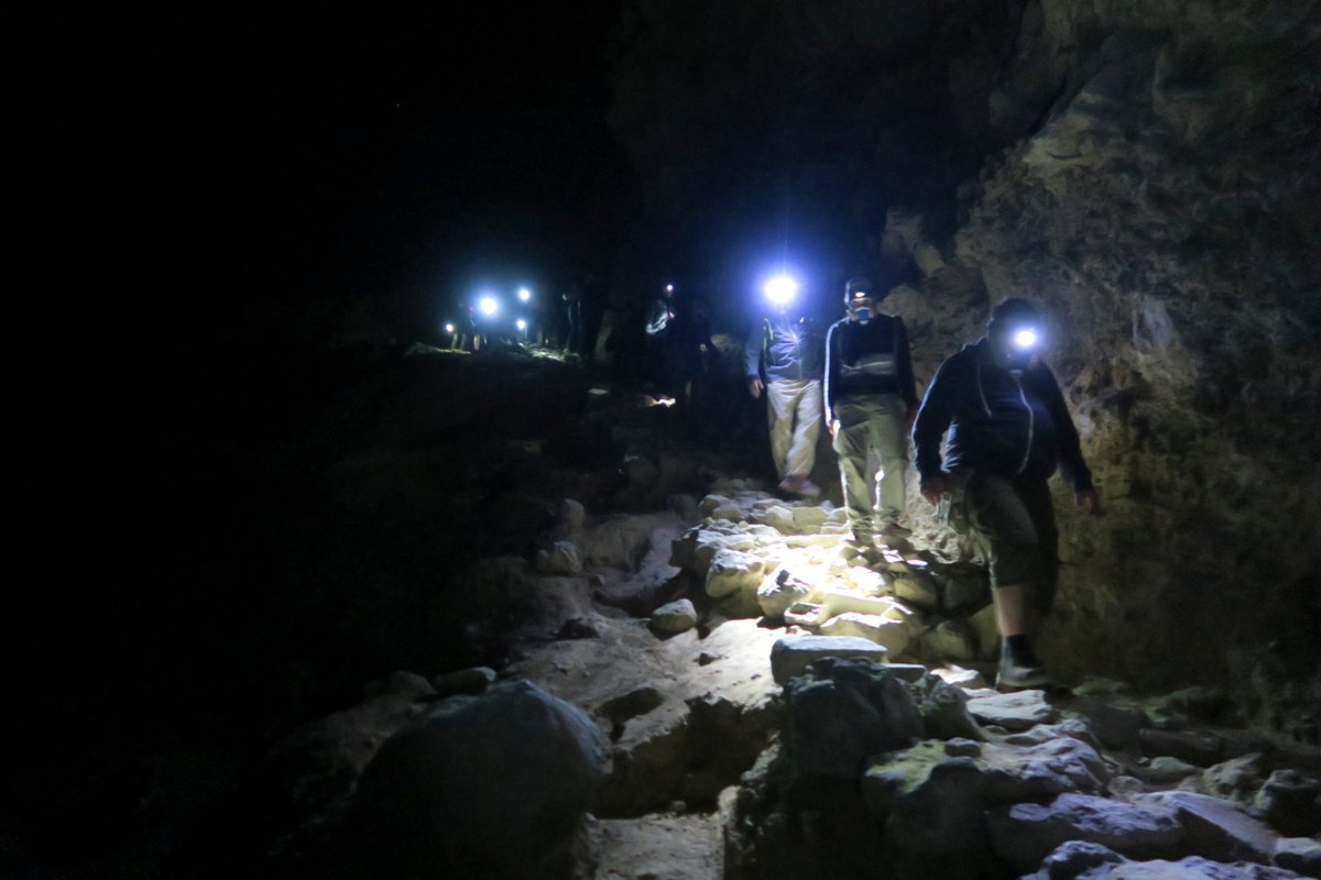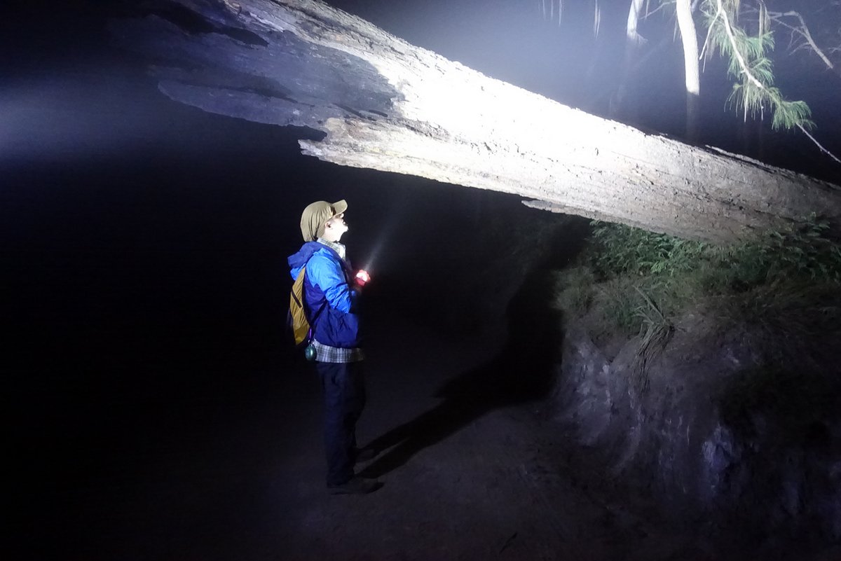 Тем временем мы подошли к кромке кратера. В темноте не совсем видно, что это она, но тут стоит табличка. Мы не задерживаемся её читать, гид ведёт нас вперёд.