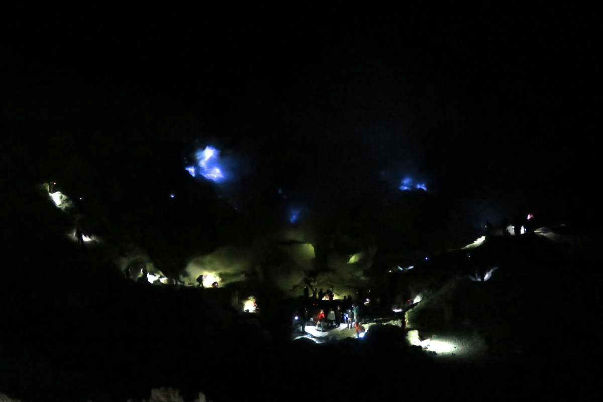 В самом центре - источник серного дыма, вокруг толпы туристов - их фонари создают разноцветную иллюминацию - некоторые попадают в облако, и оно от этого начинает светиться. Выше, над дымом - синий огонь. Люди чуть левее и выше огней стоят как раз там, куда пробрались я и Игорь. Фотография не способна передать серного запаха, который пробивал даже через фильтр маски, холодного ветра, который менял направление каждые пару минут, и неразборчивой какафонии шумов, в которой сливались голоса туристов, ревение вулканических газов и прочие звуки.