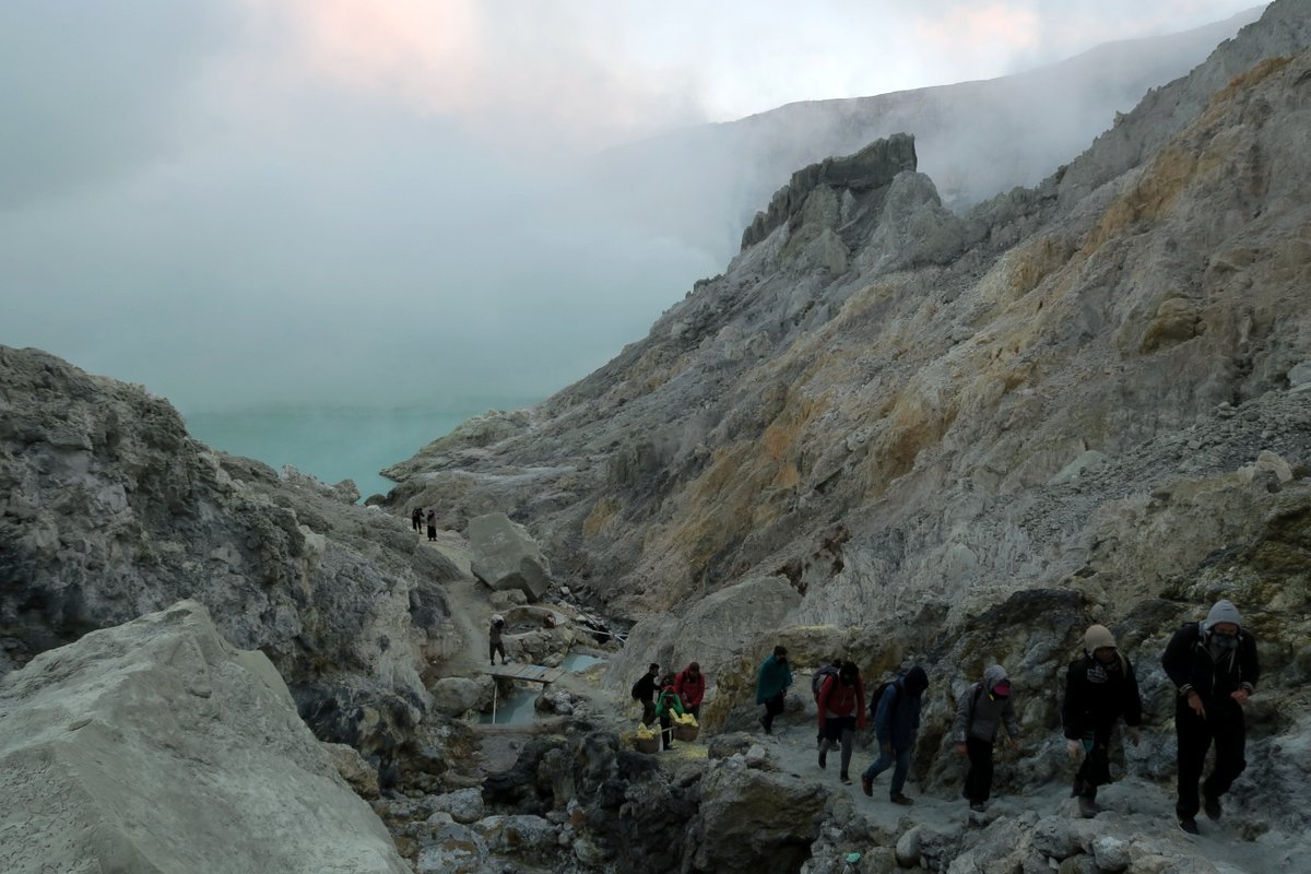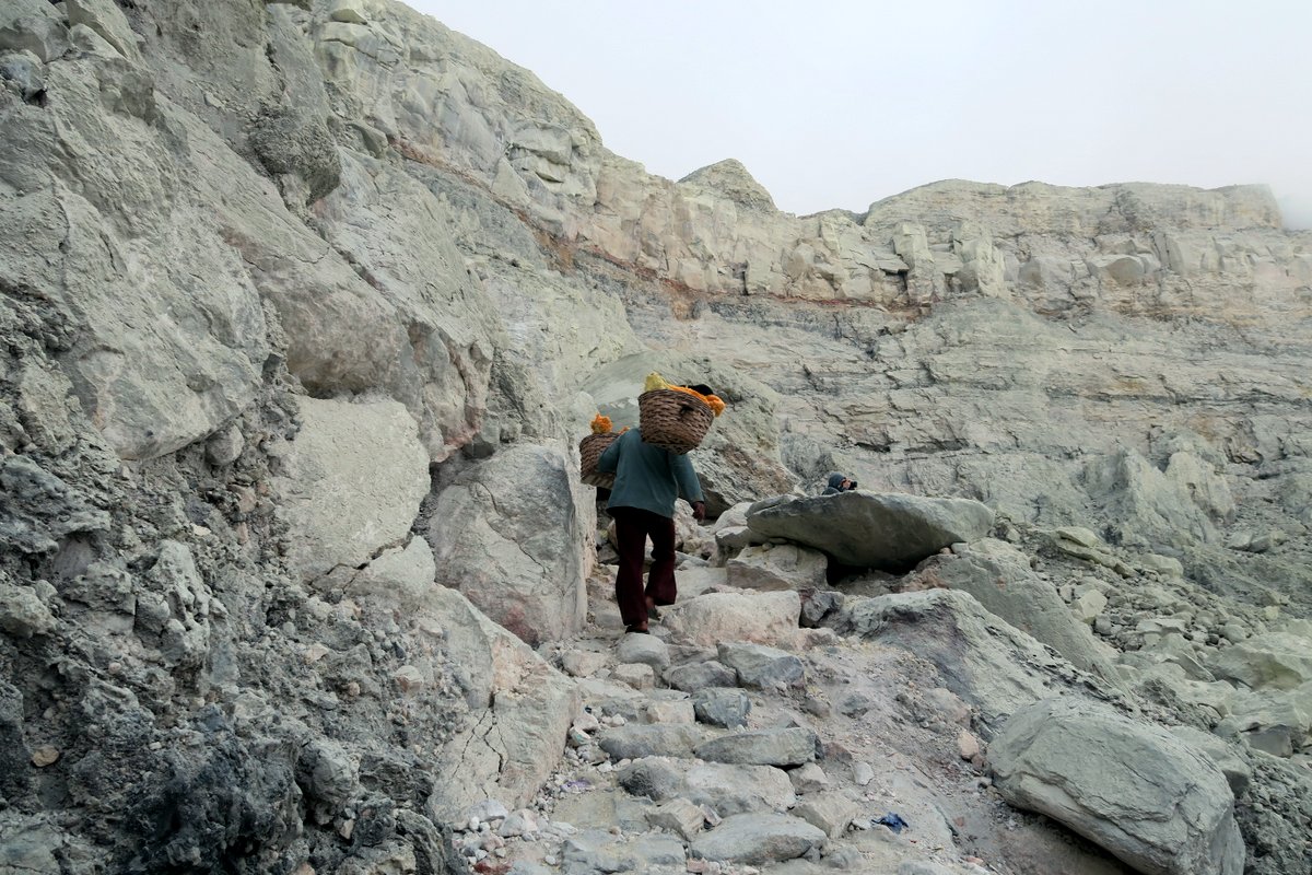 Мужчины несут эти корзины медленно, аккуратно продумывая каждый шаг (на ногах у них обыкновенные шлёпки). Этих шахтёров "нанимает" компания, управляющая серной фабрикой в деревне Лисин неподалёку. Хотя на самом деле, им просто платят за каждый килограмм доставленной серы - не совсем понятно насколько их можно считать "работниками" фабрики. Платят им копейки - за две "смены" - то есть четыре полных корзины серы, доставленных на фабрику - они могут заработать около $15. Хотя в окрестности, эта работа считается самой перспективной и высокооплачиваемой вне сферы туризма.