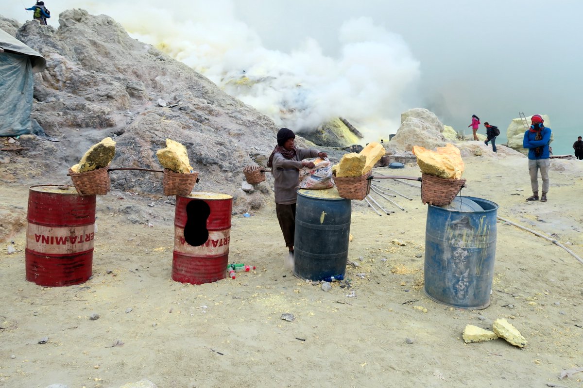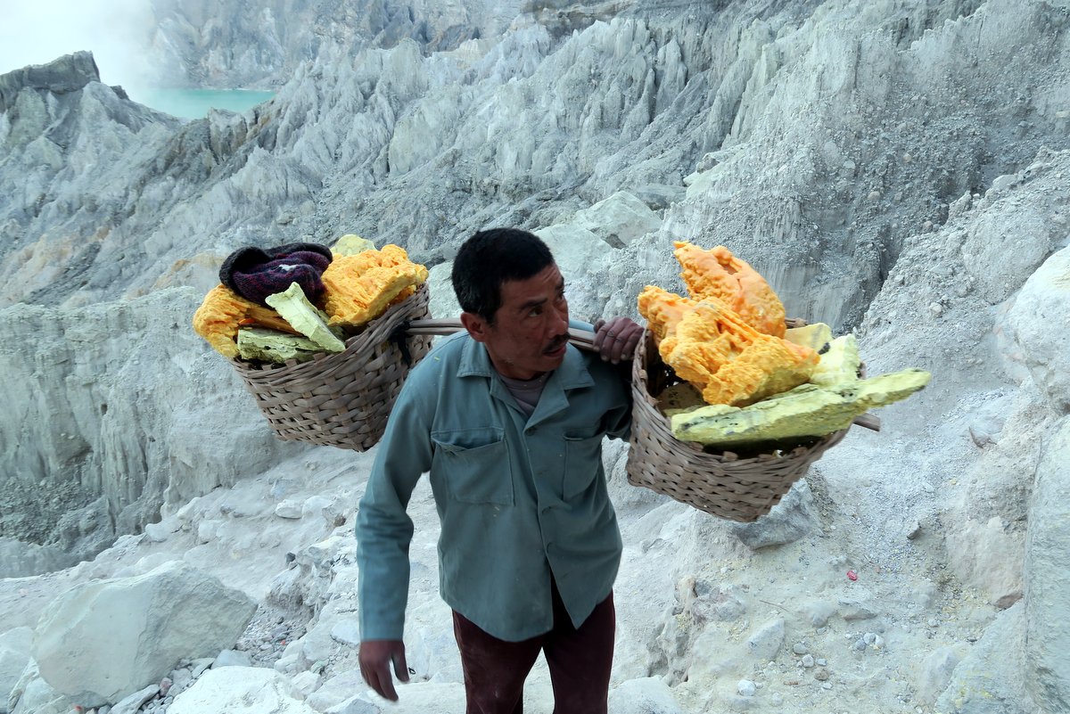 Всего этих шахтёров около 350 человек, работают они несколькими сменами. Спускаются к кратеру, откалывают куски серы, кладут их в корзины. Потом на плече поднимают к кромке вулкана, и несут где-то три километра вниз до фабрики.