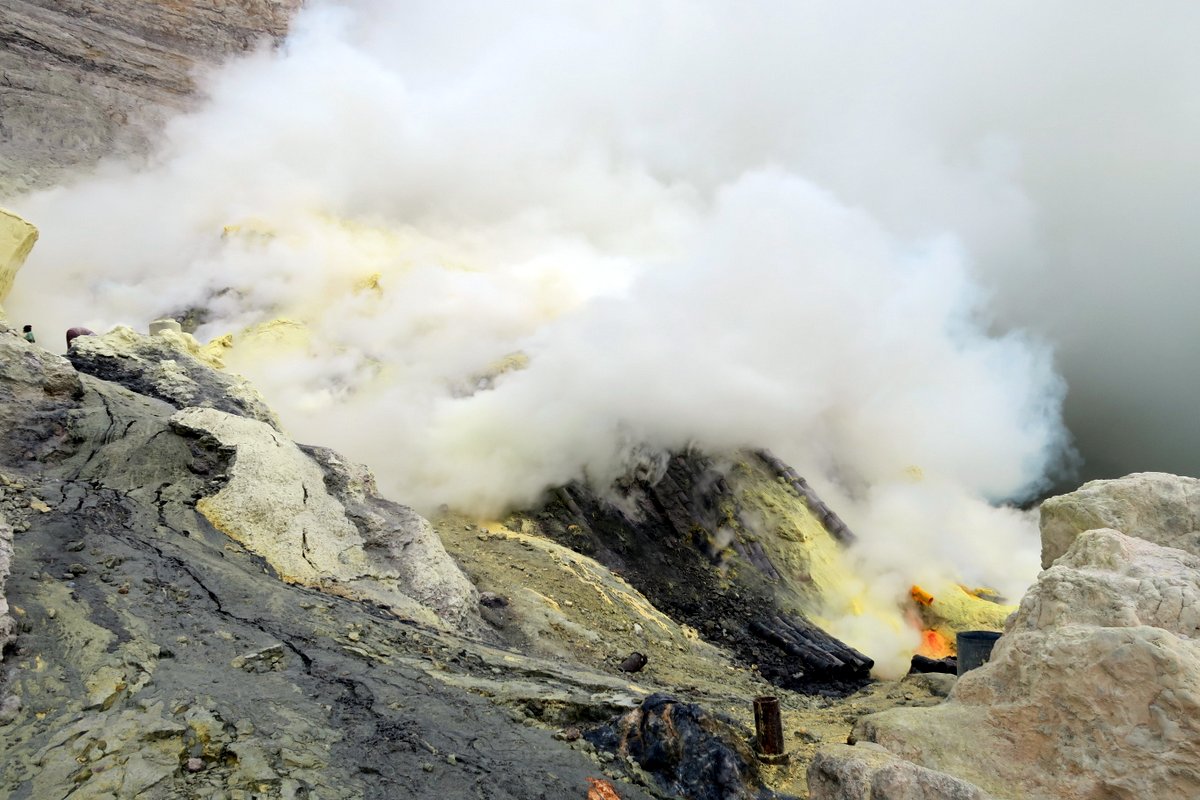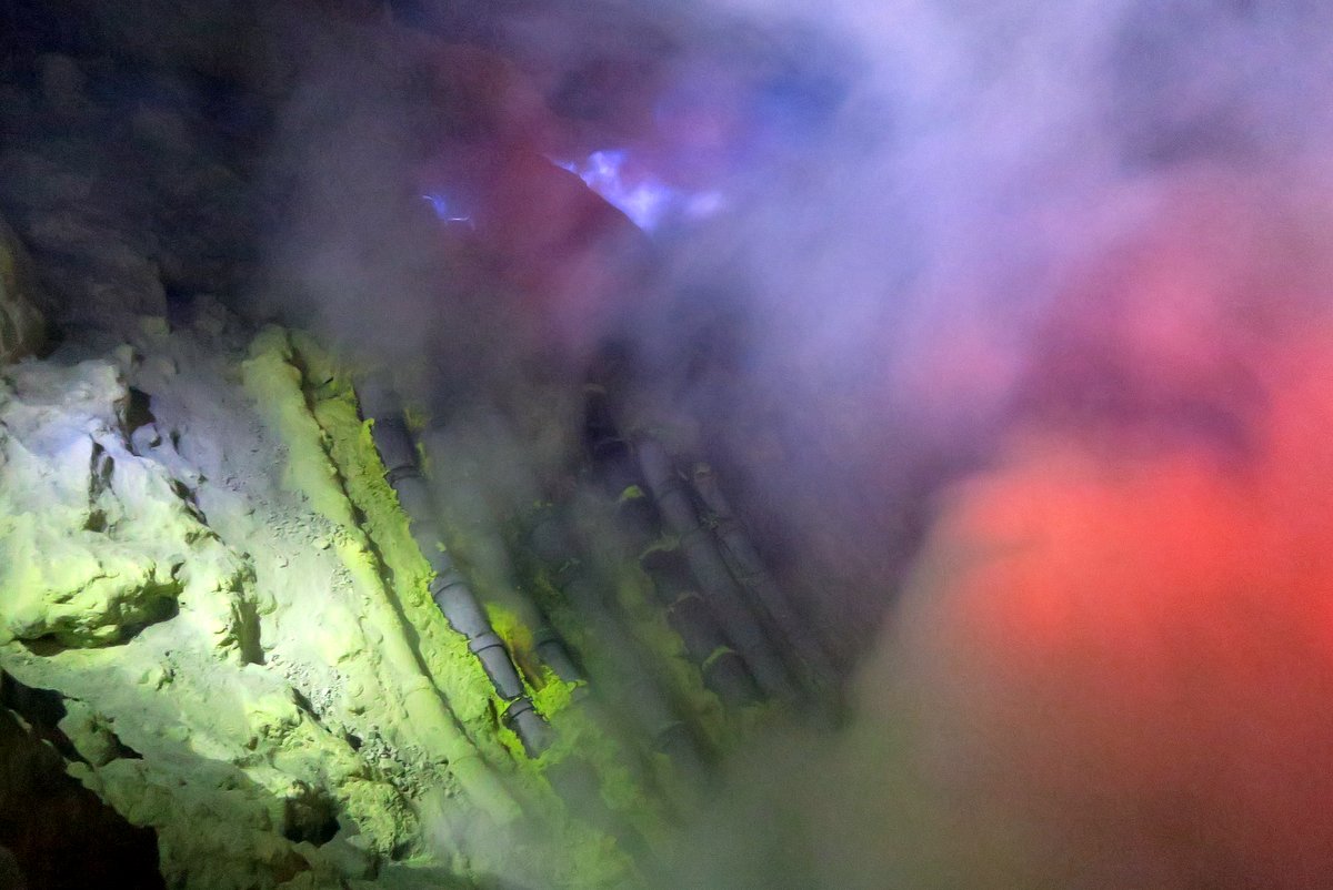 Вдруг я понял, что из клубов дыма отчётливо слышен стук железа по камню. Кто-то орудовал киркой. Как я узнал позже, сера выходит из вулкана не только газом и паром, но и в жидкой форме. В конце 1960х годов компания занимающаяся переработкой серы установила тут керамический трубы. Просто воткнула их в горную породу.