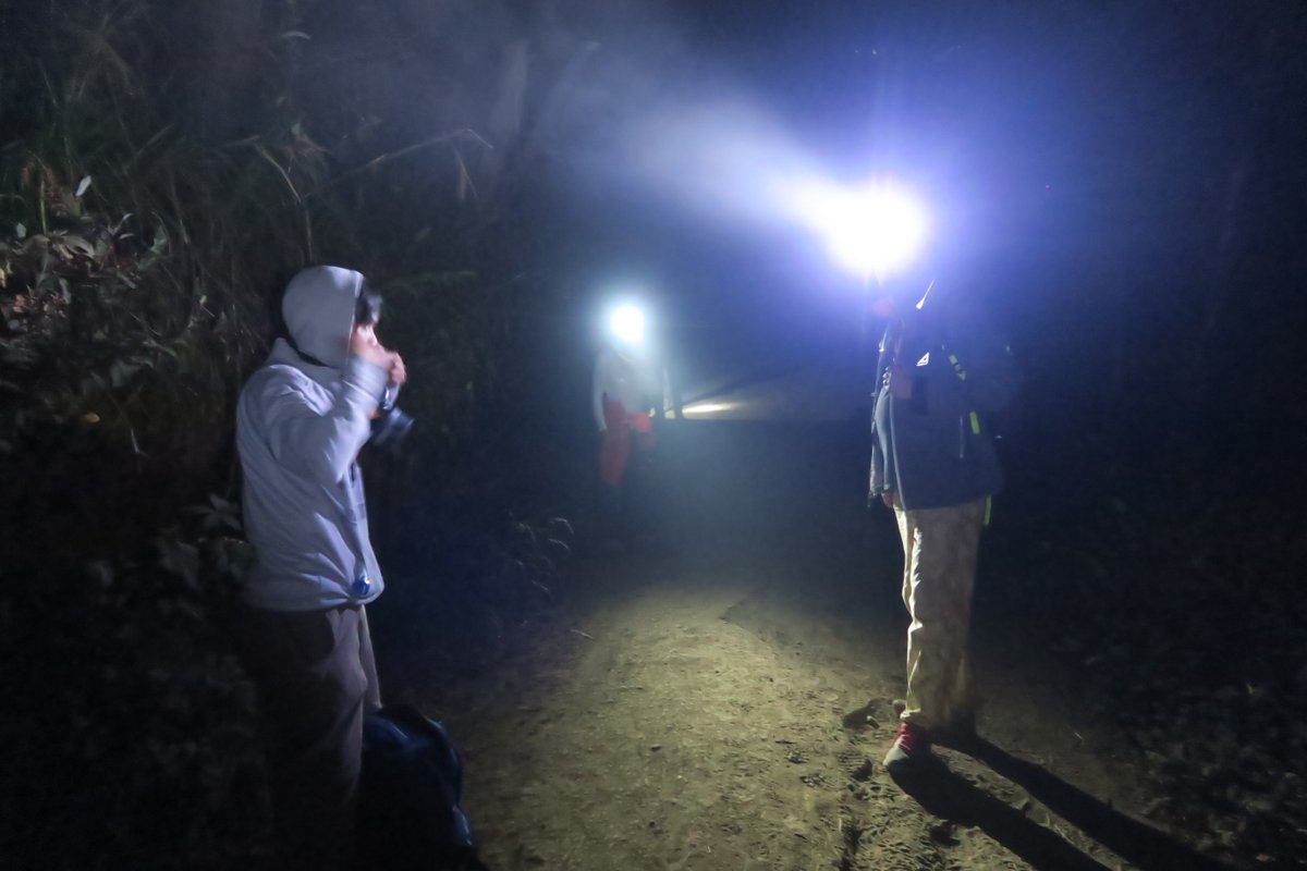 ...А точнее - вниз. Мы начинаем спускаться внутрь кальдеры. В темноте надо идти очень аккуратно, светить себе под ноги. На тропе образовывается очередь - несколько групп туристов идут одна за другой.