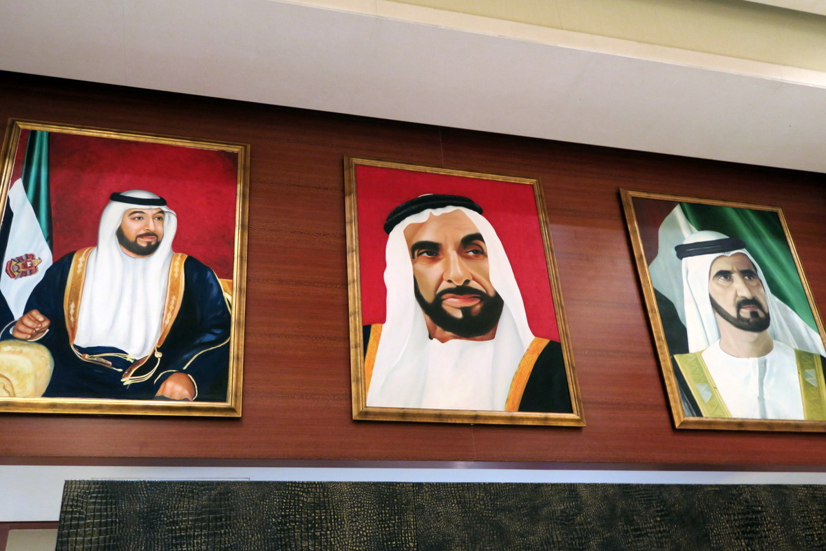 На портрете справа - эмир Дубая. (Не тот, которому посчастливилось побывать президентом, а уже его сын.) Он же кстати по совместительству вице-президент и премьер министр государства. (На эти высокие должности Верховный Совет может избрать абсолютно любого гражданина ОАЭ, являющегося эмиром Дубая.)