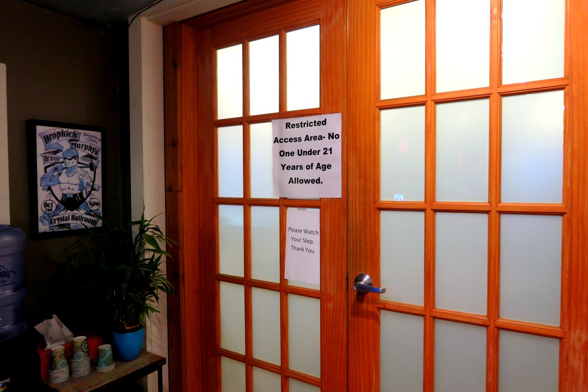 Внутри помещение разделено на две части. Сначала покупатель входит в предбанник, там у него проверяют удостоверение, чтоб убедиться, что он действительно старше 21.