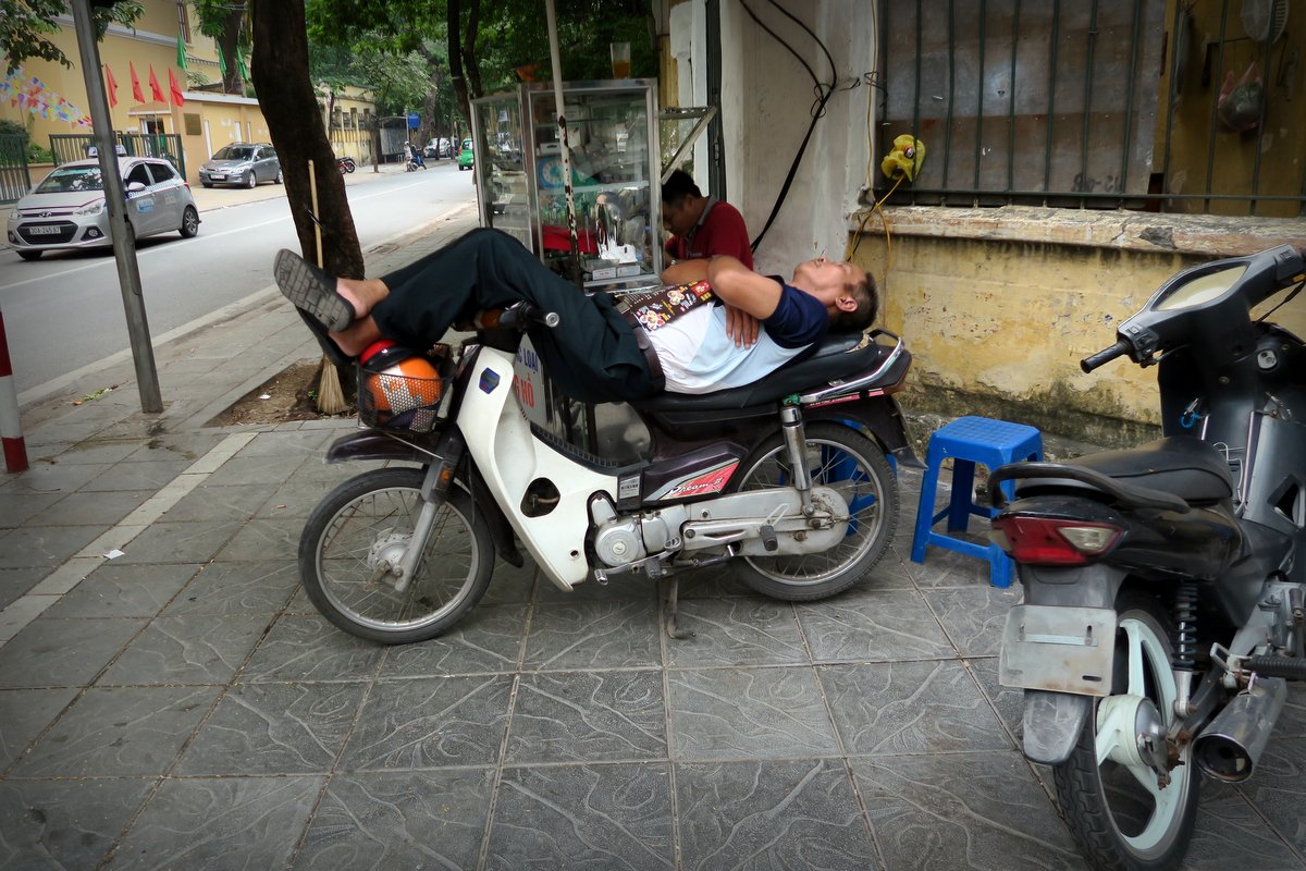 А если ты достиг следующего уровня, то можешь вообще прилечь поспать. Некоторые из нас на узких койках побаиваются упасть, а тут чуваки на припаркованном мопеде часами безмятежно дрыхнут!