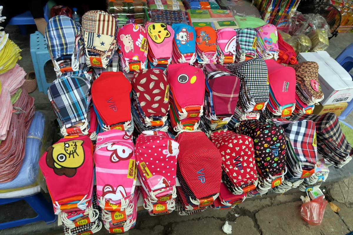 Это маски. В Ханое весьма загазовано, и каждый второй человек на мотороллере закрывает нижнюю половину лица такой вот маской. Конечно же они должны подходить к шлему, и остальному наряду.