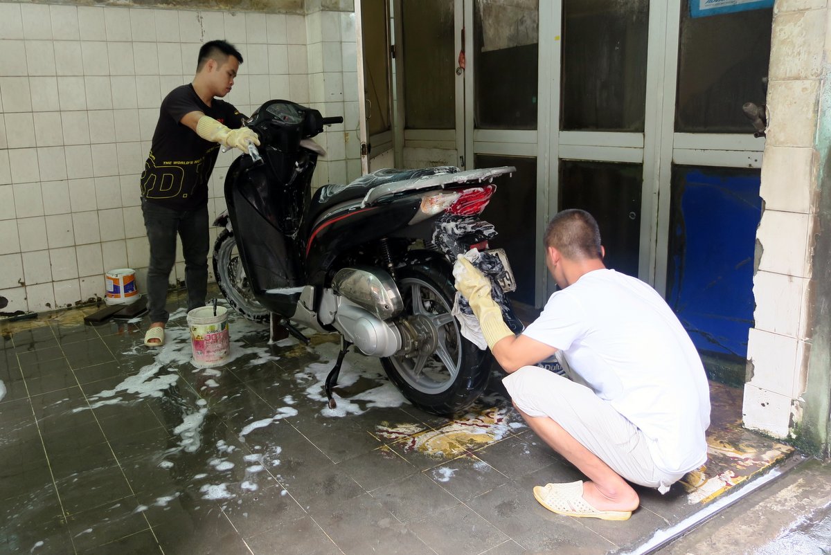 Тут есть специальные мопедо-мойки, хотя их очень немного. В основном хозяева с мытьём своих драндулетов не заморачиваются.